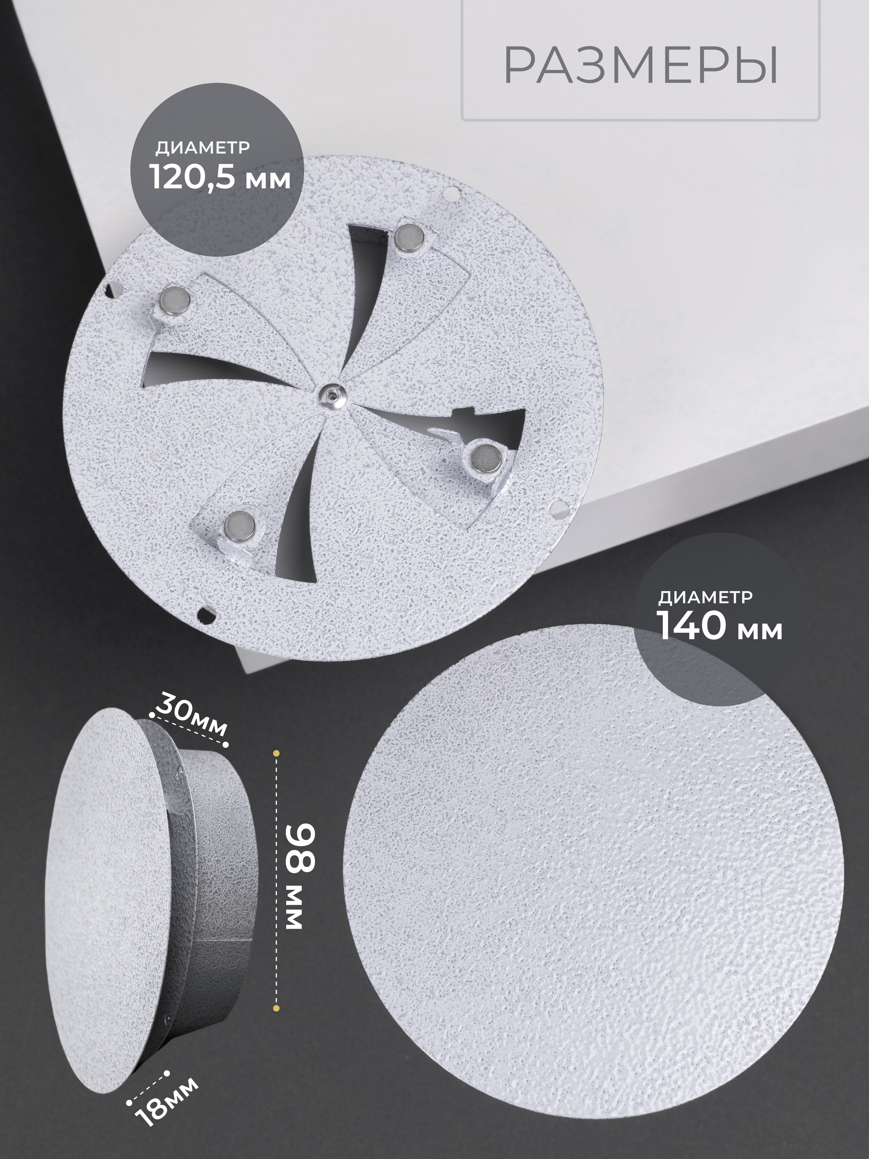 Диффузор с регулировкой от российского производителя "Родфер" выполнена из стали и состоит из двух частей. Рамка с круглым патрубком крепится к стене при помощи саморезов или клея или вставляется в трубу диаметром 100 мм, а декоративная часть фиксируется к рамке при помощи магнитов.