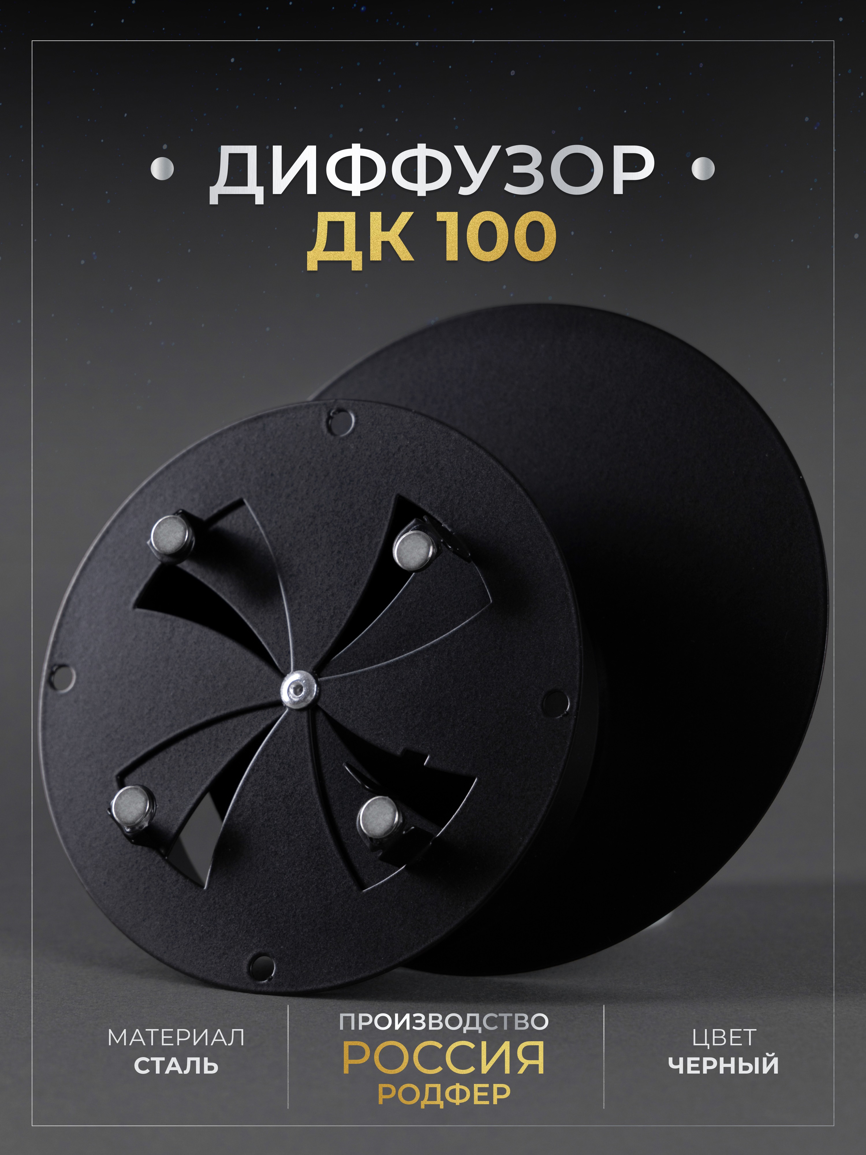 Диффузор с регулировкой от российского производителя "Родфер" выполнена из стали и состоит из двух частей. Рамка с круглым патрубком крепится к стене при помощи саморезов или клея или вставляется в трубу диаметром 100 мм, а декоративная часть фиксируется к рамке при помощи магнитов.