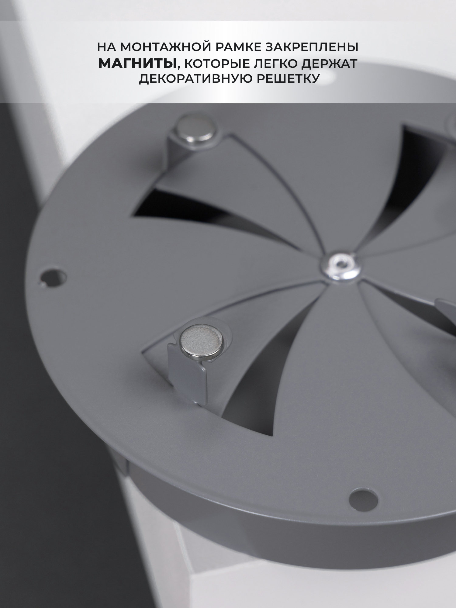 Диффузор с регулировкой от российского производителя "Родфер" выполнена из стали и состоит из двух частей. Рамка с круглым патрубком крепится к стене при помощи саморезов или клея или вставляется в трубу диаметром 100 мм, а декоративная часть фиксируется к рамке при помощи магнитов.