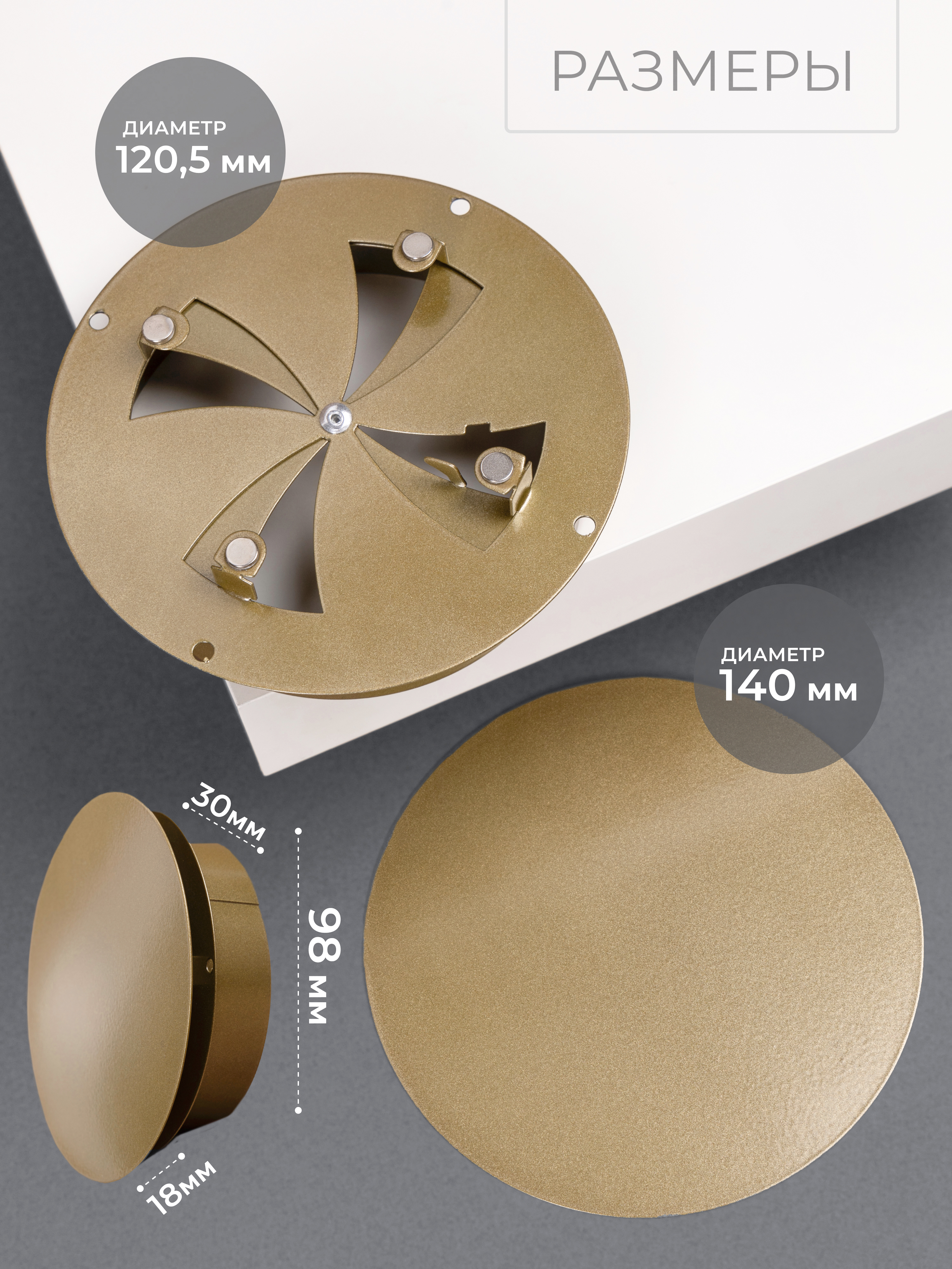 Диффузор с регулировкой от российского производителя "Родфер" выполнена из стали и состоит из двух частей. Рамка с круглым патрубком крепится к стене при помощи саморезов или клея или вставляется в трубу диаметром 100 мм, а декоративная часть фиксируется к рамке при помощи магнитов.