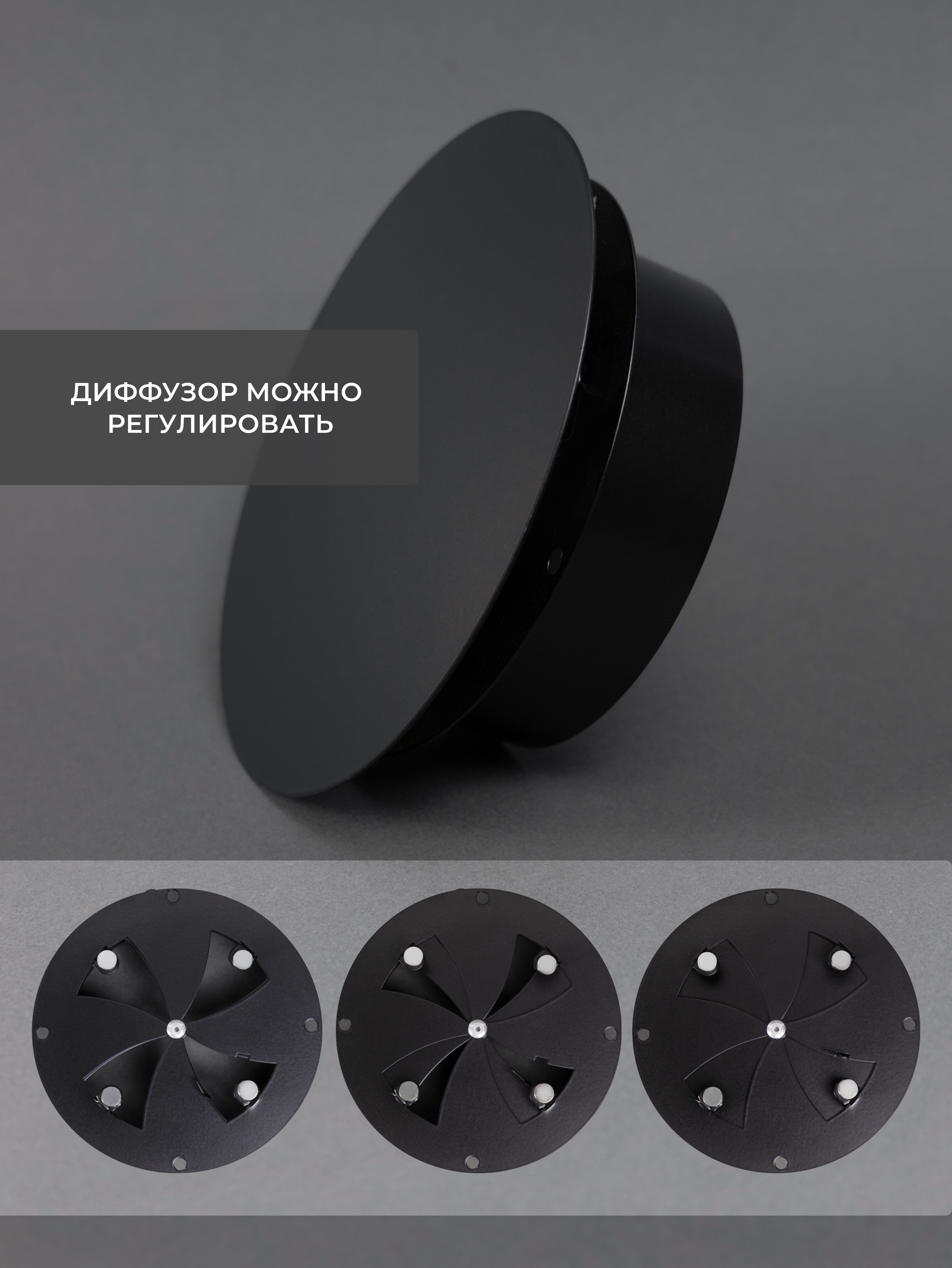 Диффузор с регулировкой от российского производителя "Родфер" выполнена из стали и состоит из двух частей. Рамка с круглым патрубком крепится к стене при помощи саморезов или клея или вставляется в трубу диаметром 100 мм, а декоративная часть фиксируется к рамке при помощи магнитов.