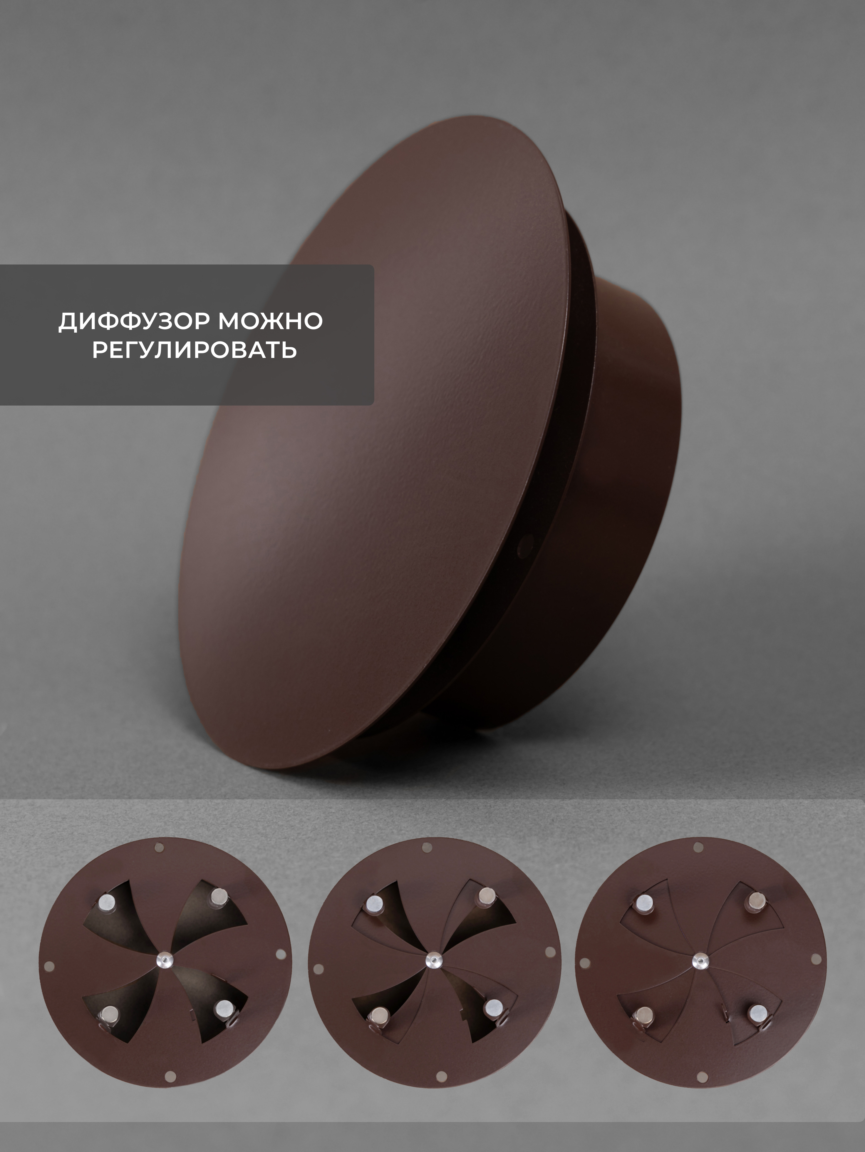 Диффузор с регулировкой от российского производителя "Родфер" выполнена из стали и состоит из двух частей. Рамка с круглым патрубком крепится к стене при помощи саморезов или клея или вставляется в трубу диаметром 100 мм, а декоративная часть фиксируется к рамке при помощи магнитов.