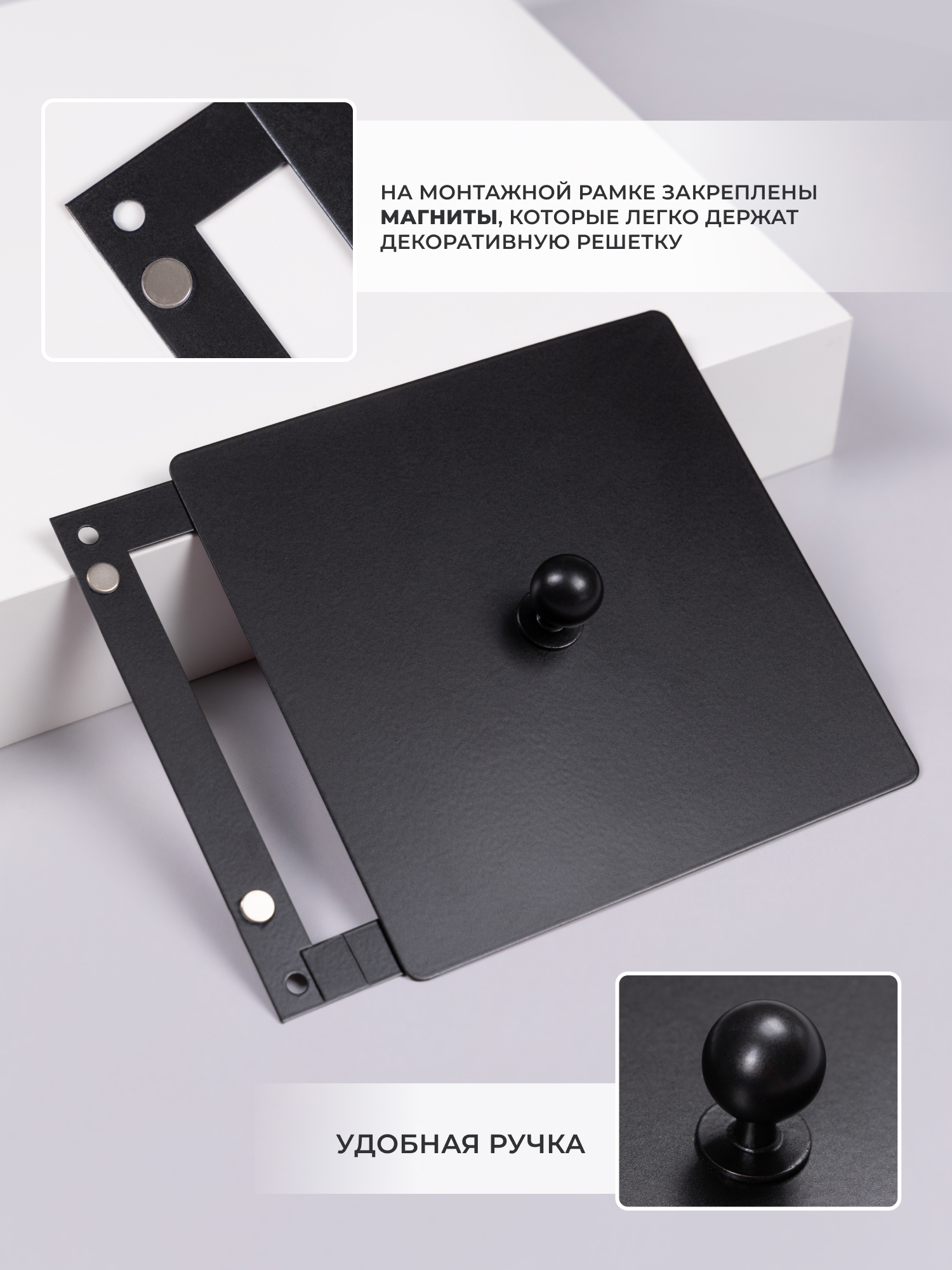 Декоративный люк состоит из 2-х частей. Рамка крепится к стене с помощью саморезов, а декоративная панель фиксируется к рамке с помощью магнитов. Передняя панель плоская  и по центру панели имеется удобная ручка для быстрого снятия. Люки используются для доступа к скрытым коммуникациям, счетчикам, датчикам, нишам и тд. Выполнен из стали и окрашен в печи. Подходит для установки на стену.