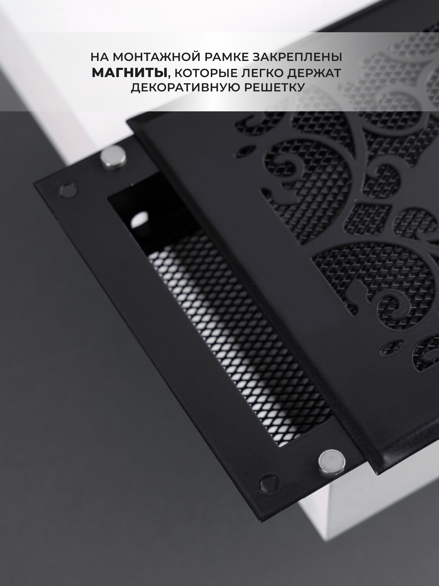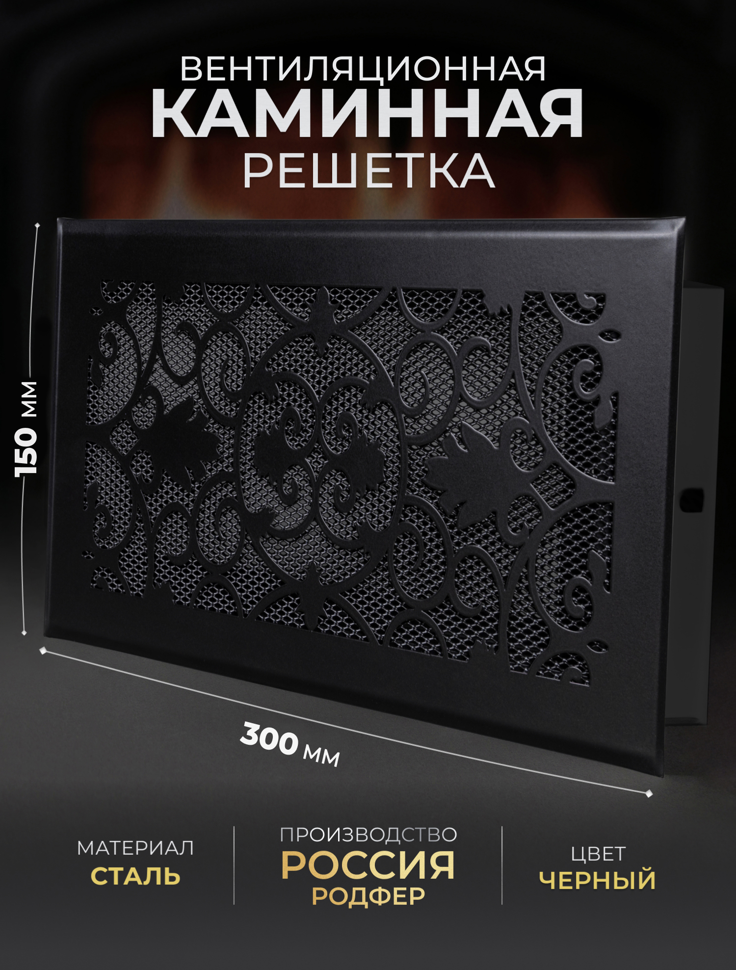 Металлическая вентиляционная решетка каминная Родфер выполнена из стали и состоит из двух частей. Рамка крепится в отверстие тепловой камеры при помощи саморезов или клея, а декоративная часть с сеткой фиксируется к рамке при помощи магнитов. Рамка и наружная часть выкрашены порошковой краской в специальной печке (камере полимеризации).