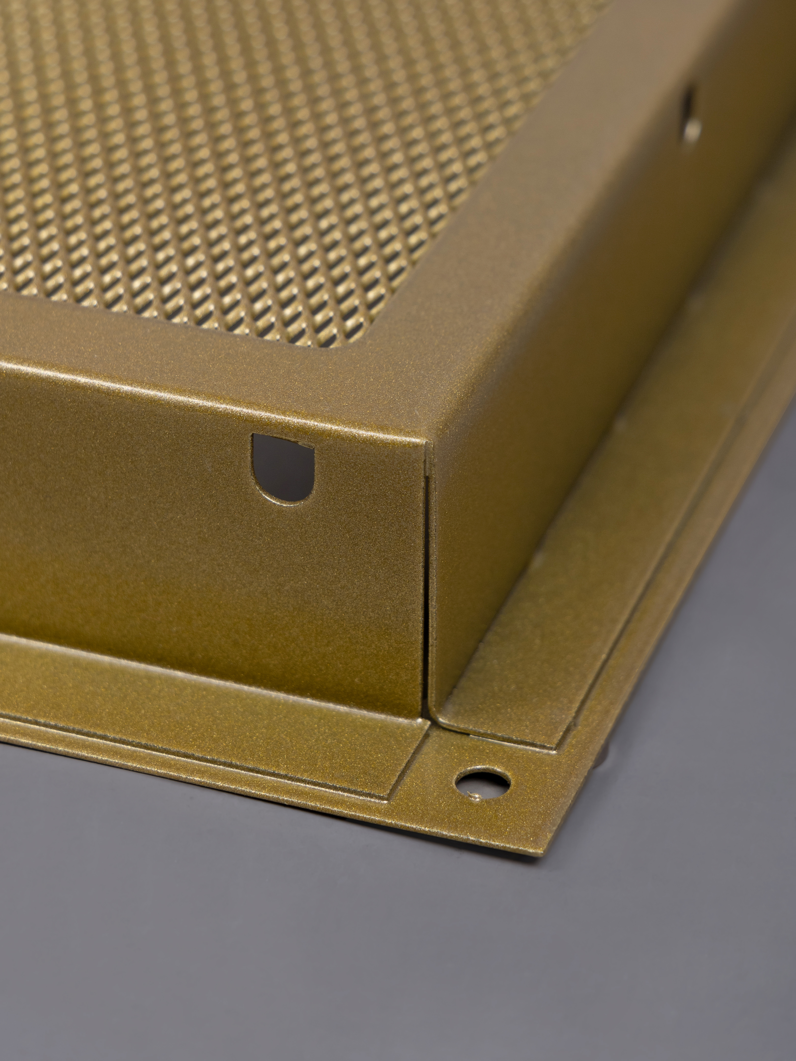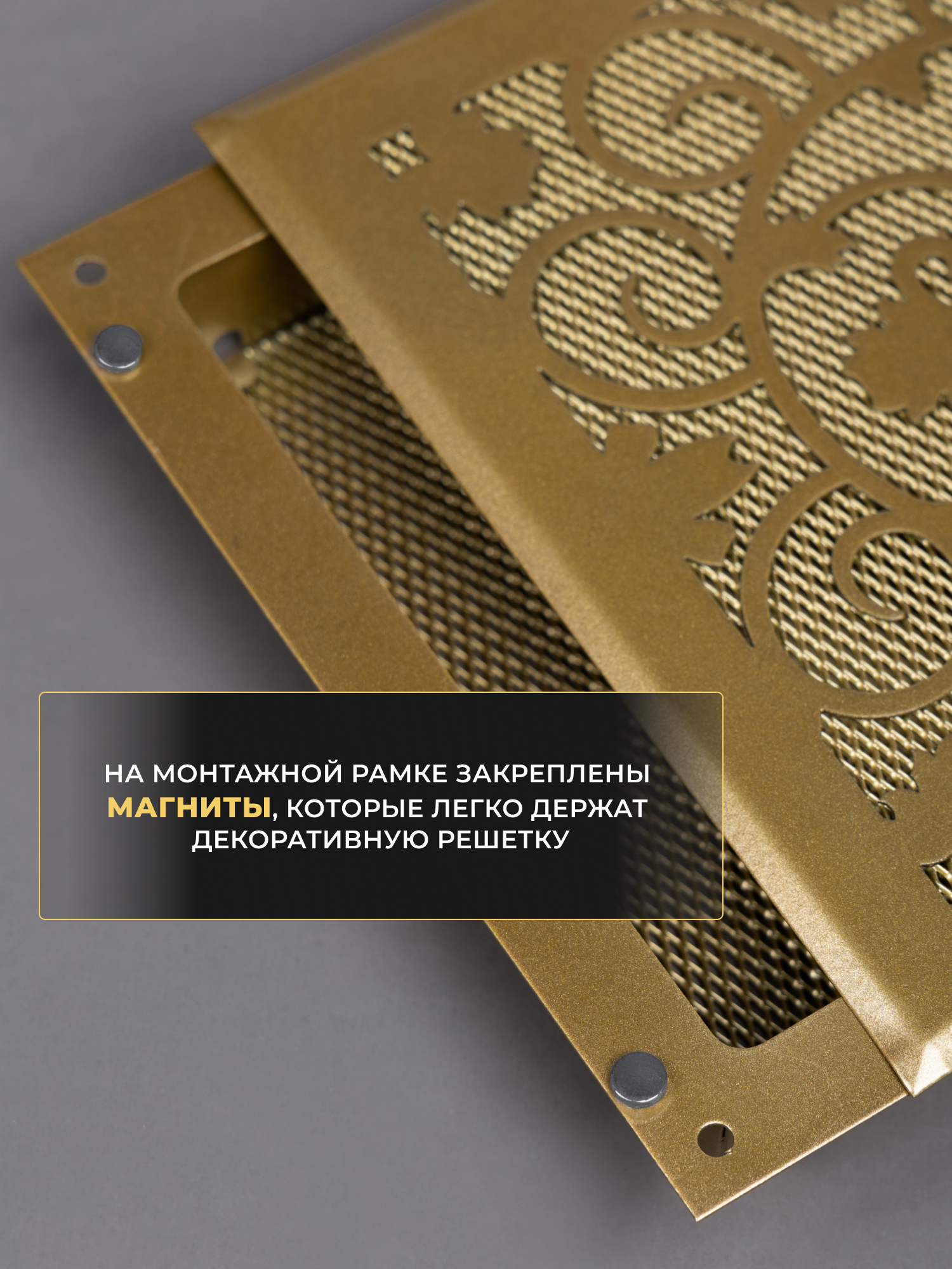 Металлическая вентиляционная решетка каминная Родфер выполнена из стали и состоит из двух частей. Рамка крепится в отверстие тепловой камеры при помощи саморезов или клея, а декоративная часть с сеткой фиксируется к рамке при помощи магнитов. Рамка и наружная часть выкрашены порошковой краской в специальной печке (камере полимеризации).