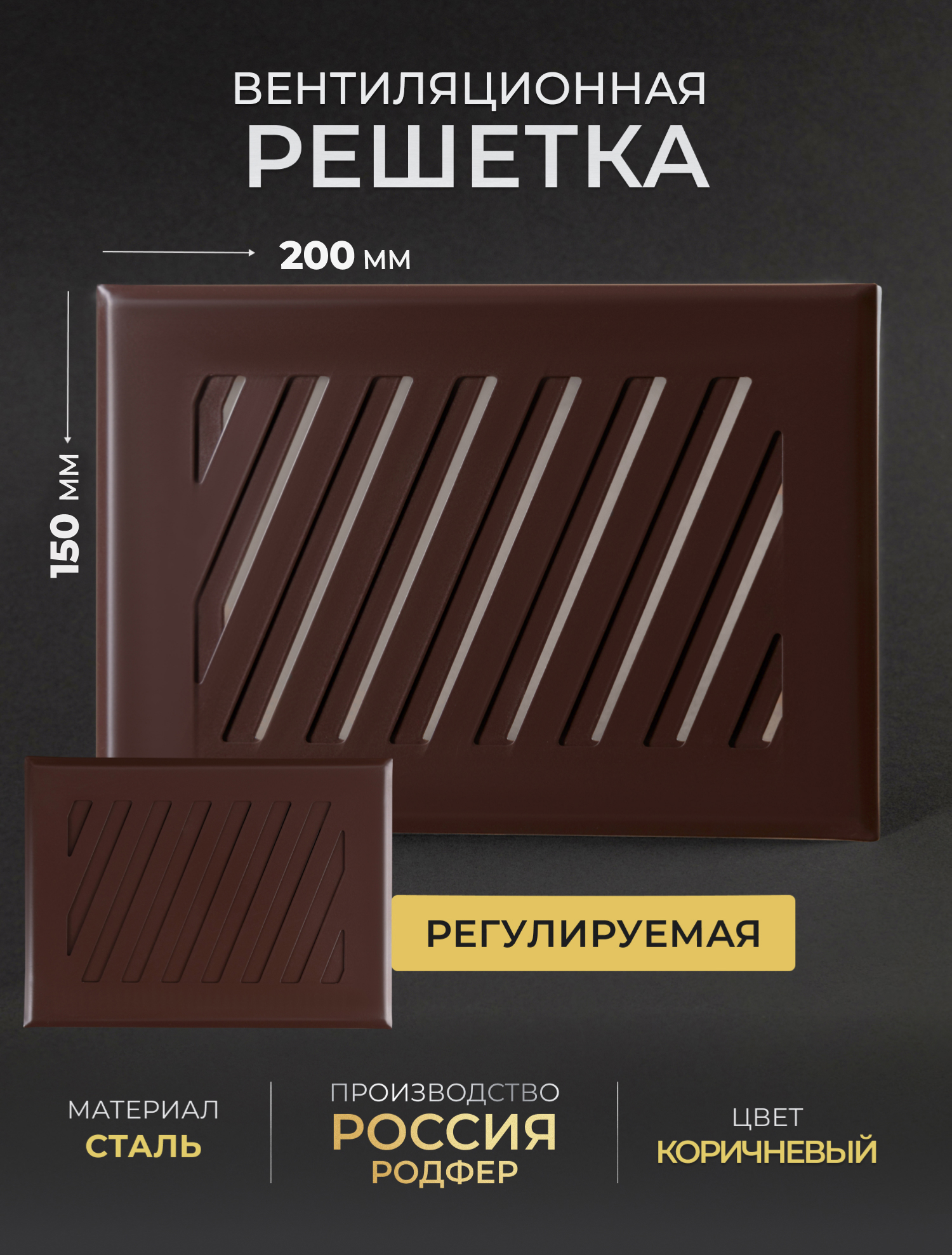 Решетка вентиляционная регулируемая Заслонка от российского производителя "Родфер" выполнена из стали и состоит из двух частей. Рамка крепится к стене при помощи саморезов или жидких гвоздей, а декоративная часть с регулировкой фиксируется к рамке при помощи неодимовых магнитов. С помощью рычага можно увеличивать или уменьшать до полного перекрытия поток воздуха. Для того, что бы отрегулировать сечение -достаточно повернуть рычажок.