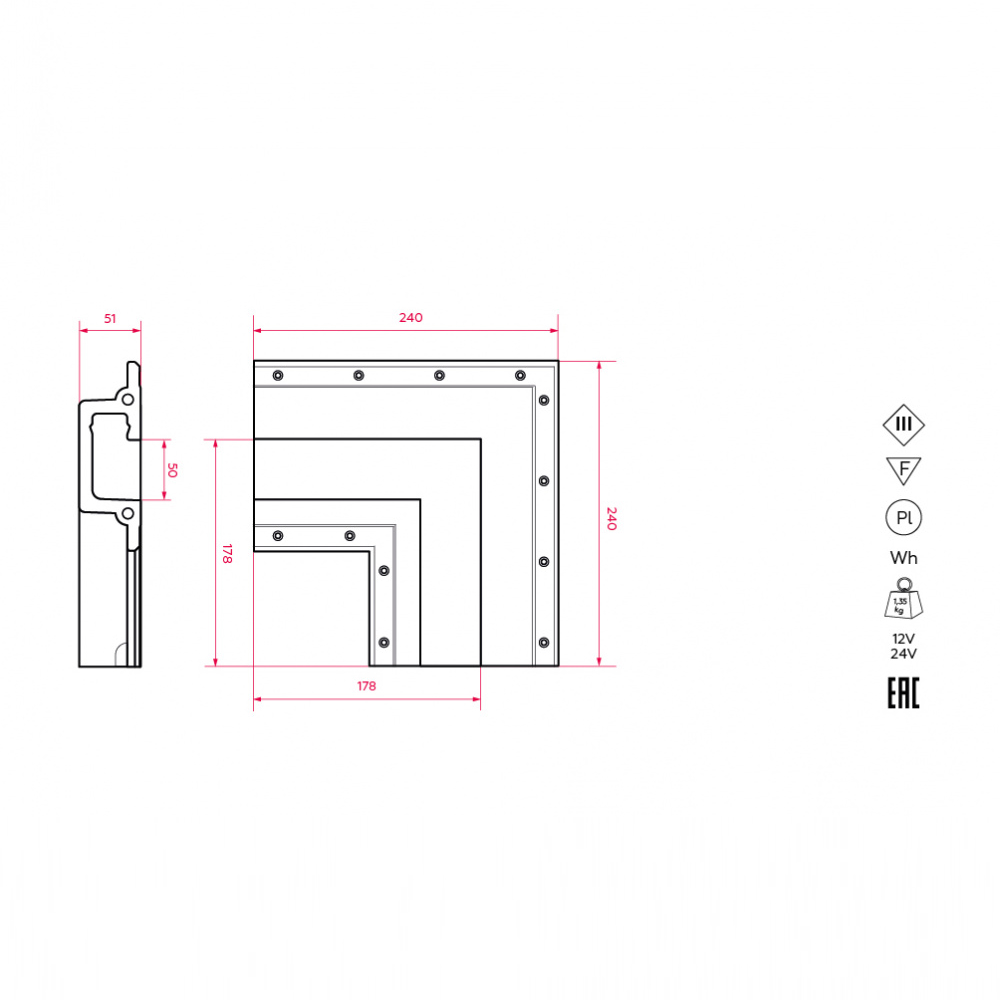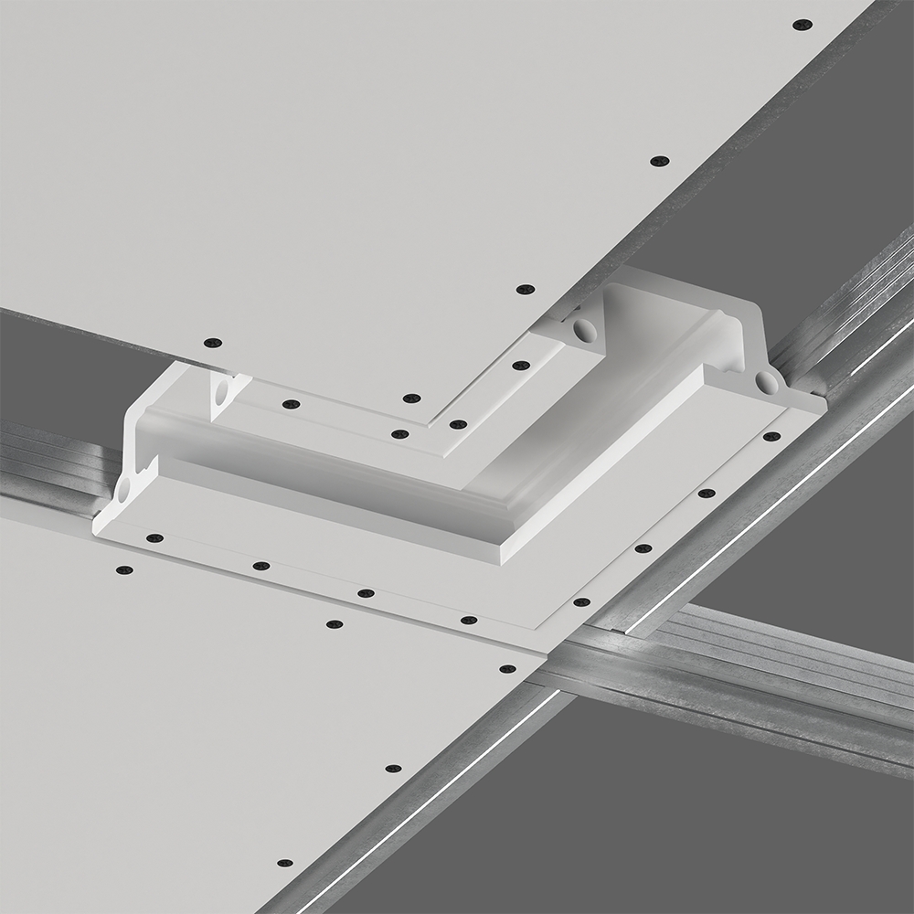 Соединительный элемент (внешний угол 90) встраиваемой профильной гипсовой системы освещения отражённого света SABER 50 для установки в потолках и стенах из гипсокартона.