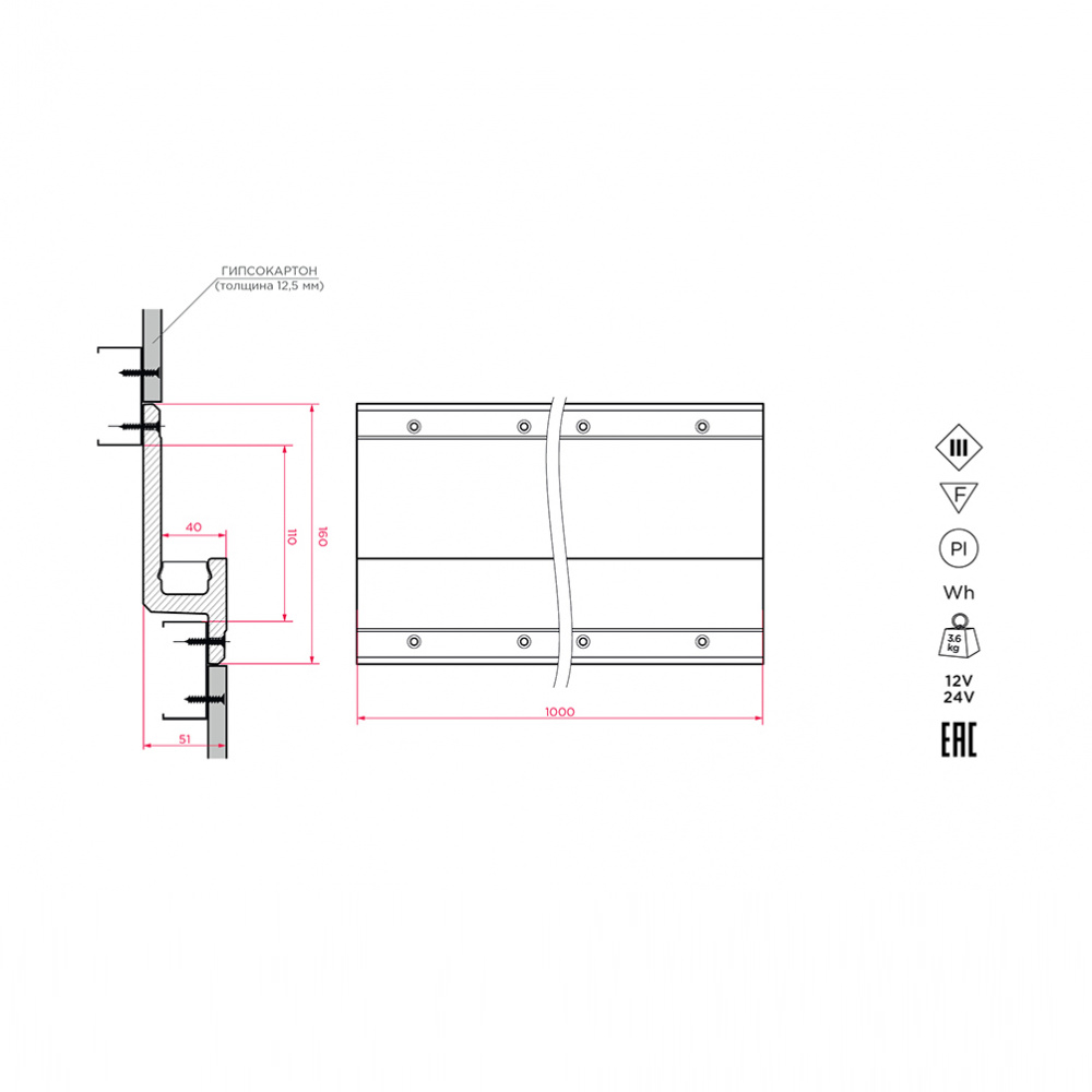 Линейный элемент встраиваемой профильной гипсовой системы освещения отражённого света SABER 50С для установки в потолках и стенах из гипсокартона.
