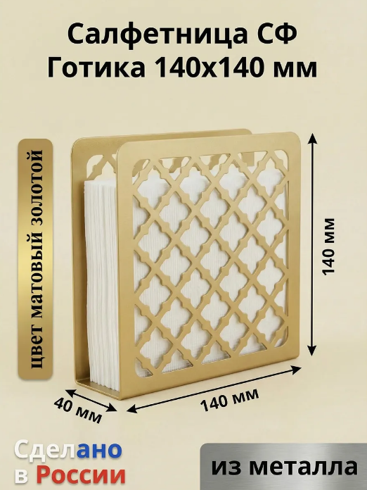Салфетница СФ Готика 140х140 мм. Глубина салфетницы 40 мм. Сделано из металла. Дизайн, в котором выполнена салфетница, полностью повторяет рисунок вентиляционных решеток нашего производства серии РКВГОТ. Например, РКВГОТ200, РКВГОТ150. Наши дизайнеры специально разработали парные товары в едином стиле, чтобы сделать вашу кухню уютной и красивой.