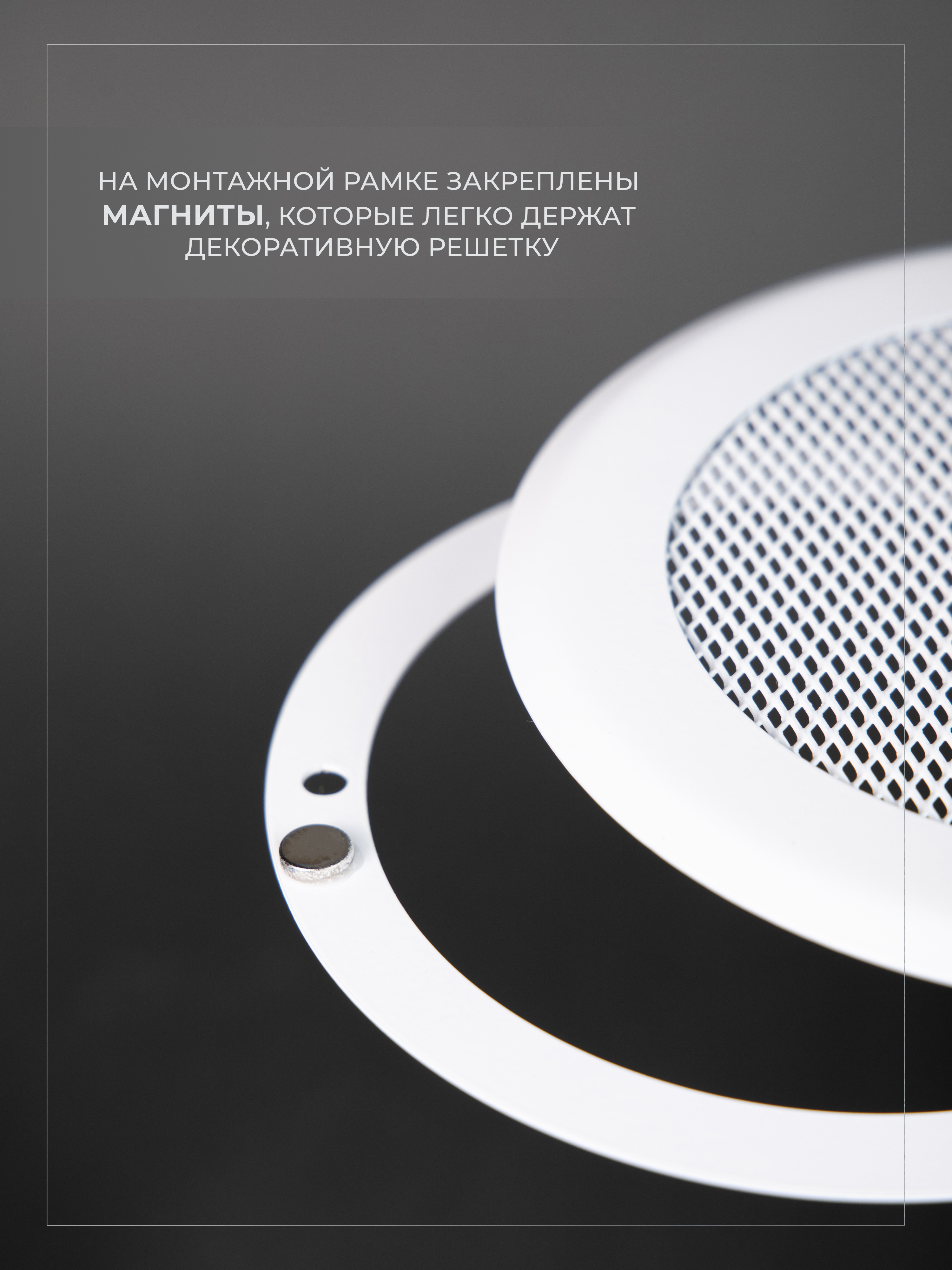 Вентиляционная решетка на магнитах выполнена из стали и состоит из двух частей. Рамка крепится к стене при помощи саморезов (не в комплекте) или клея, а декоративная часть фиксируется к рамке при помощи неодимовых магнитов. Рамка и наружная часть выкрашены порошковой эмалью в специальной печке (камере полимеризации).