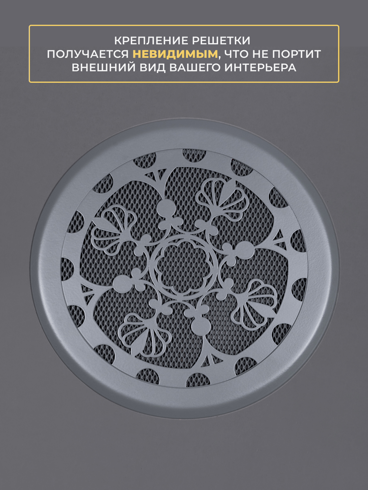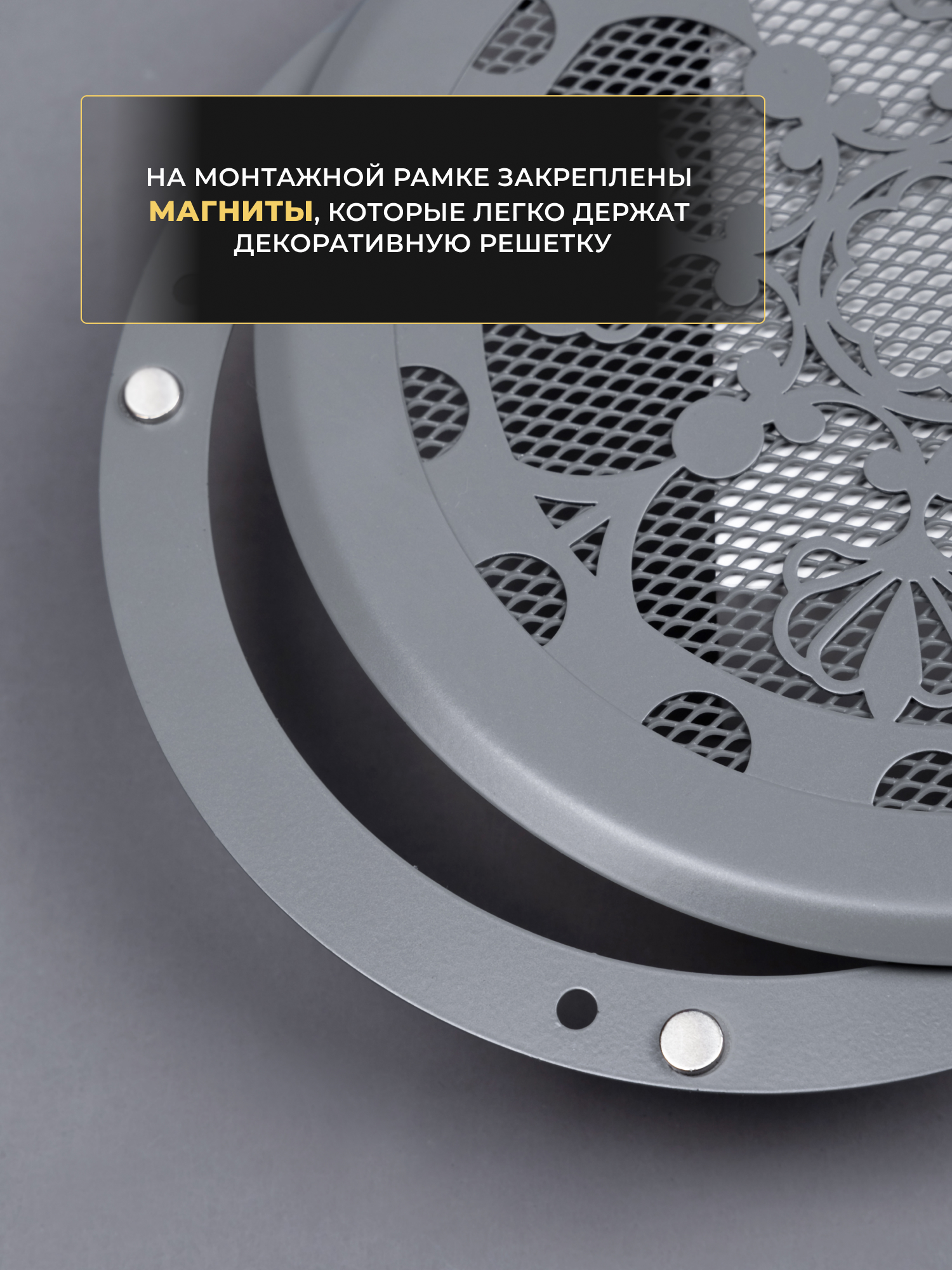 Вентиляционная решетка на магнитах выполнена из стали и состоит из двух частей. Рамка крепится к стене при помощи саморезов (не в комплекте) или клея, а декоративная часть фиксируется к рамке при помощи неодимовых магнитов. Рамка и наружная часть выкрашены порошковой эмалью в специальной печке (камере полимеризации).