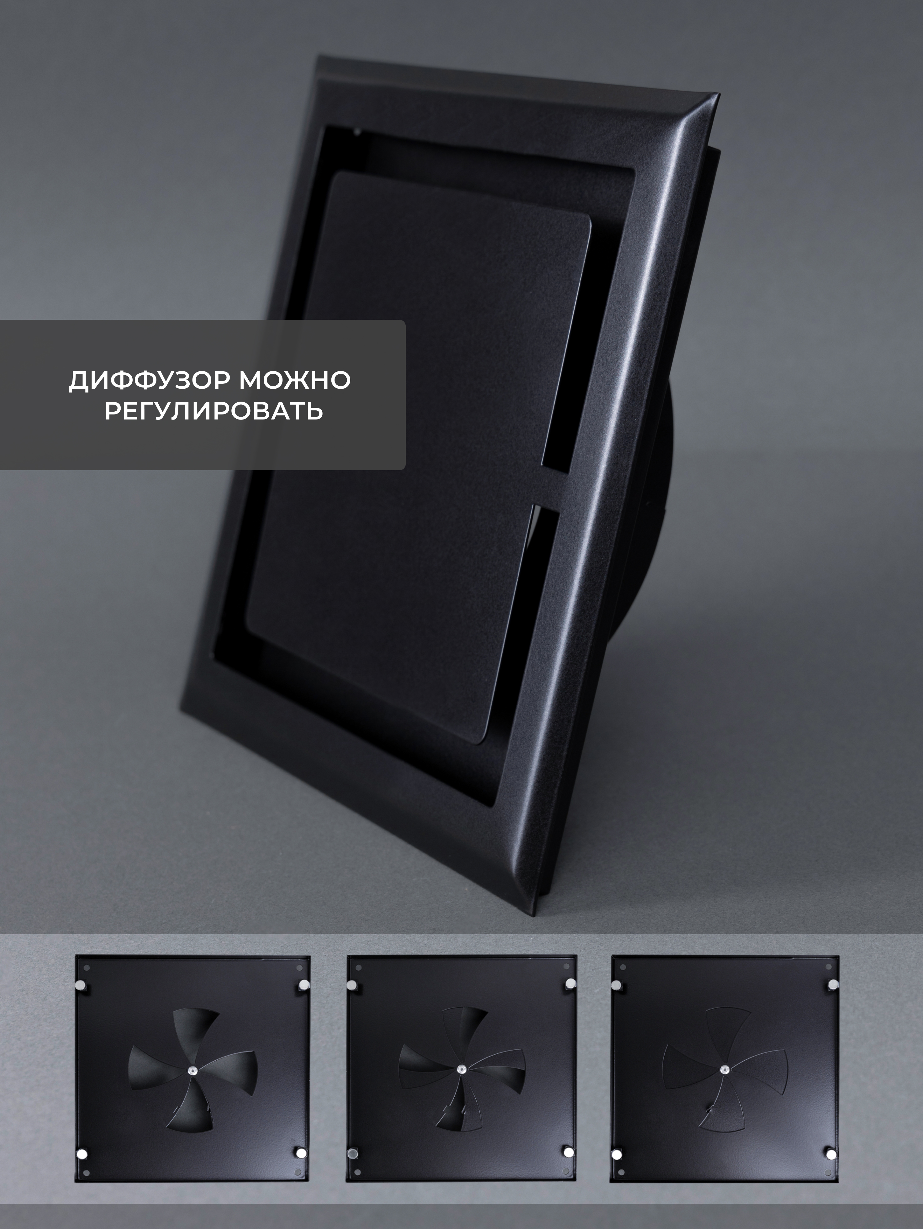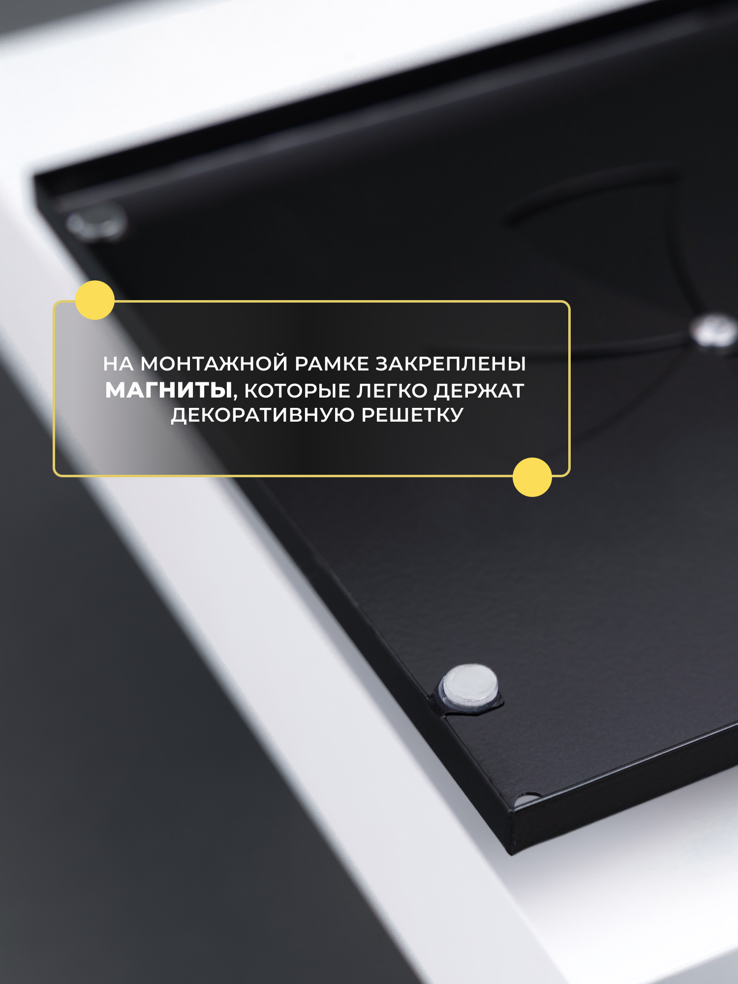 Рамка 180х180мм с круглым патрубком крепится к стене при помощи саморезов или клея или вставляется в трубу диаметром 125 мм, а декоративная часть фиксируется к рамке при помощи магнитов. В патрубок вмонтирован механизм регулировки.