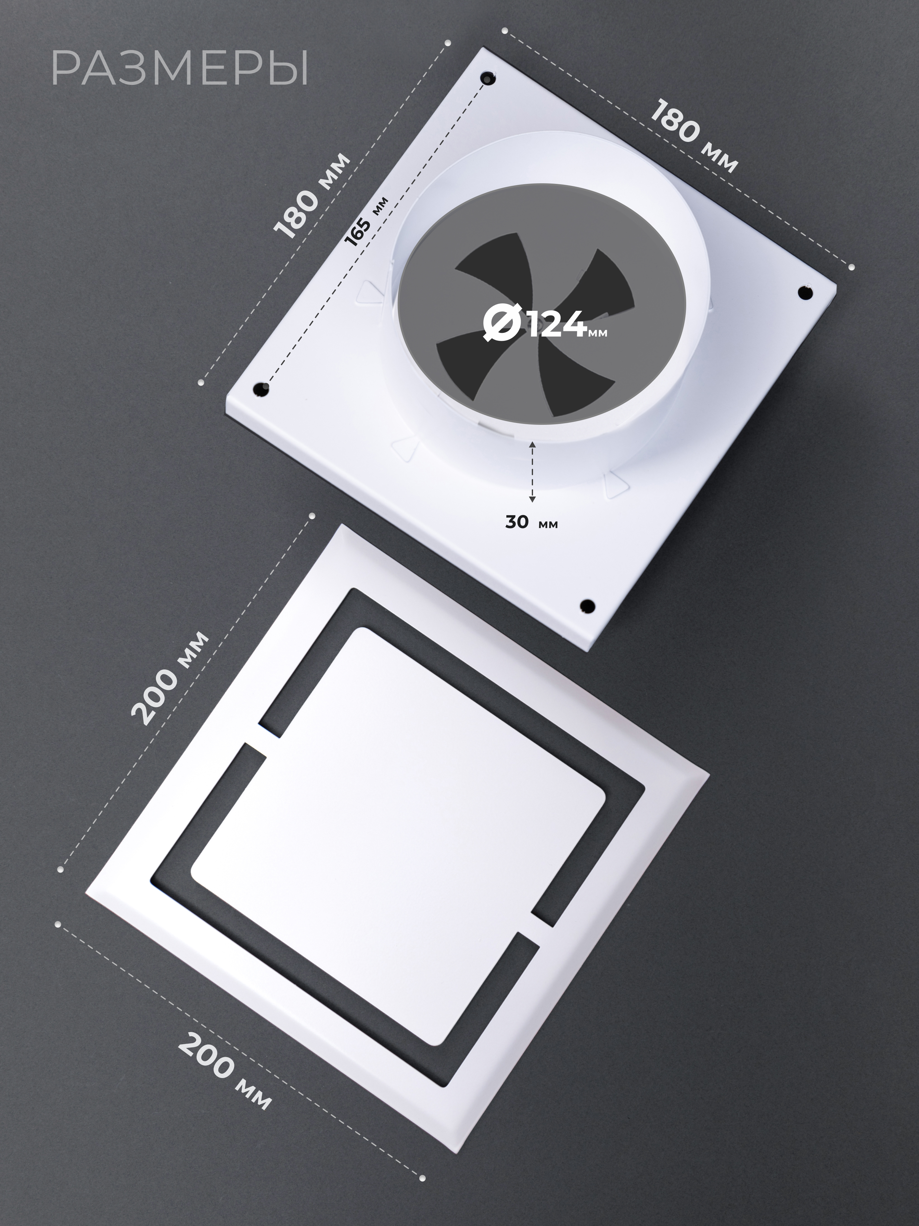 Рамка 180х180мм с круглым патрубком крепится к стене при помощи саморезов или клея или вставляется в трубу диаметром 125 мм, а декоративная часть фиксируется к рамке при помощи магнитов. В патрубок вмонтирован механизм регулировки.