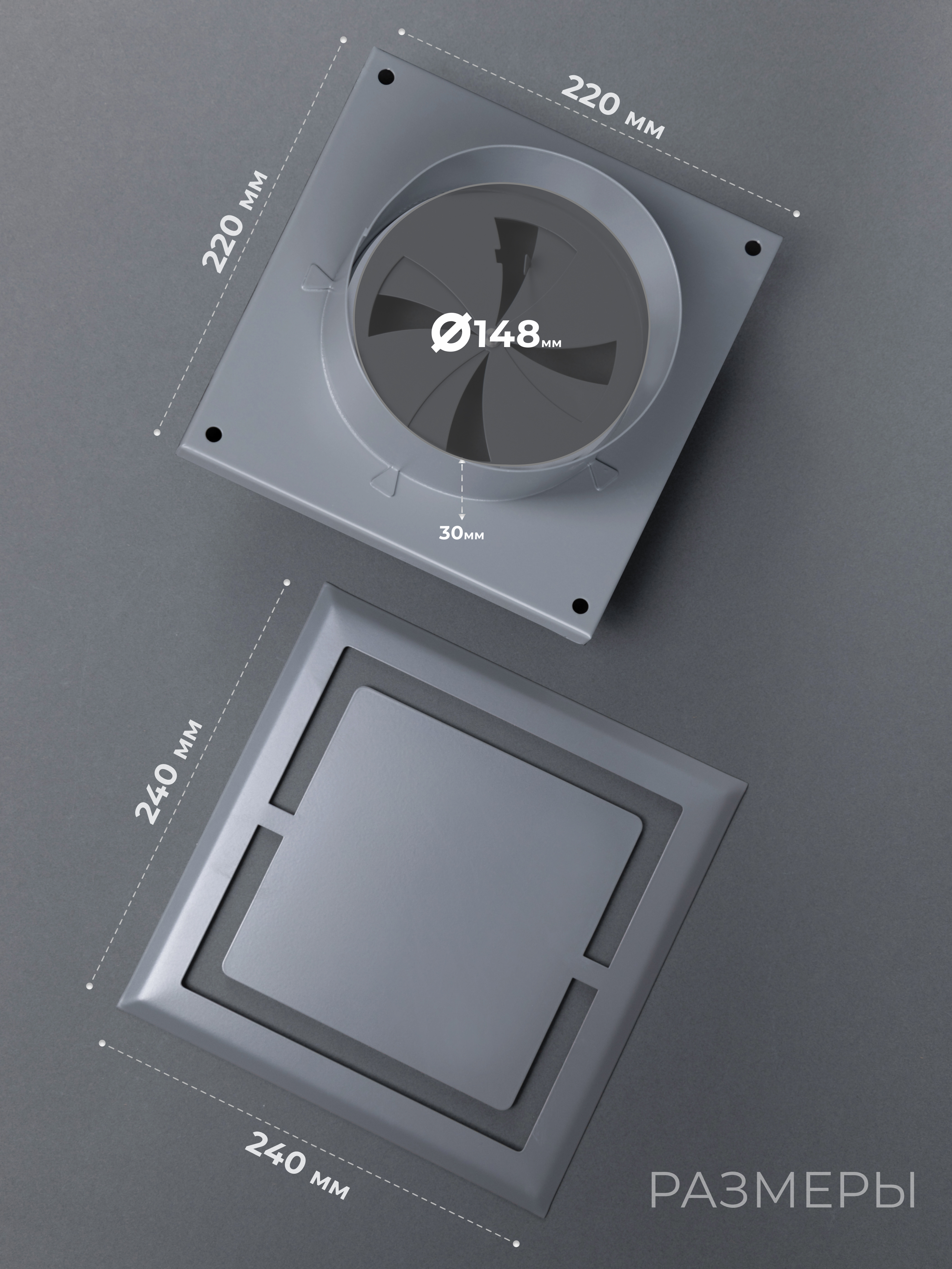 Рамка 220х220мм с круглым патрубком крепится к стене при помощи саморезов или клея или вставляется в трубу диаметром 150 мм, а декоративная часть фиксируется к рамке при помощи магнитов. В патрубок вмонтирован механизм регулировки.