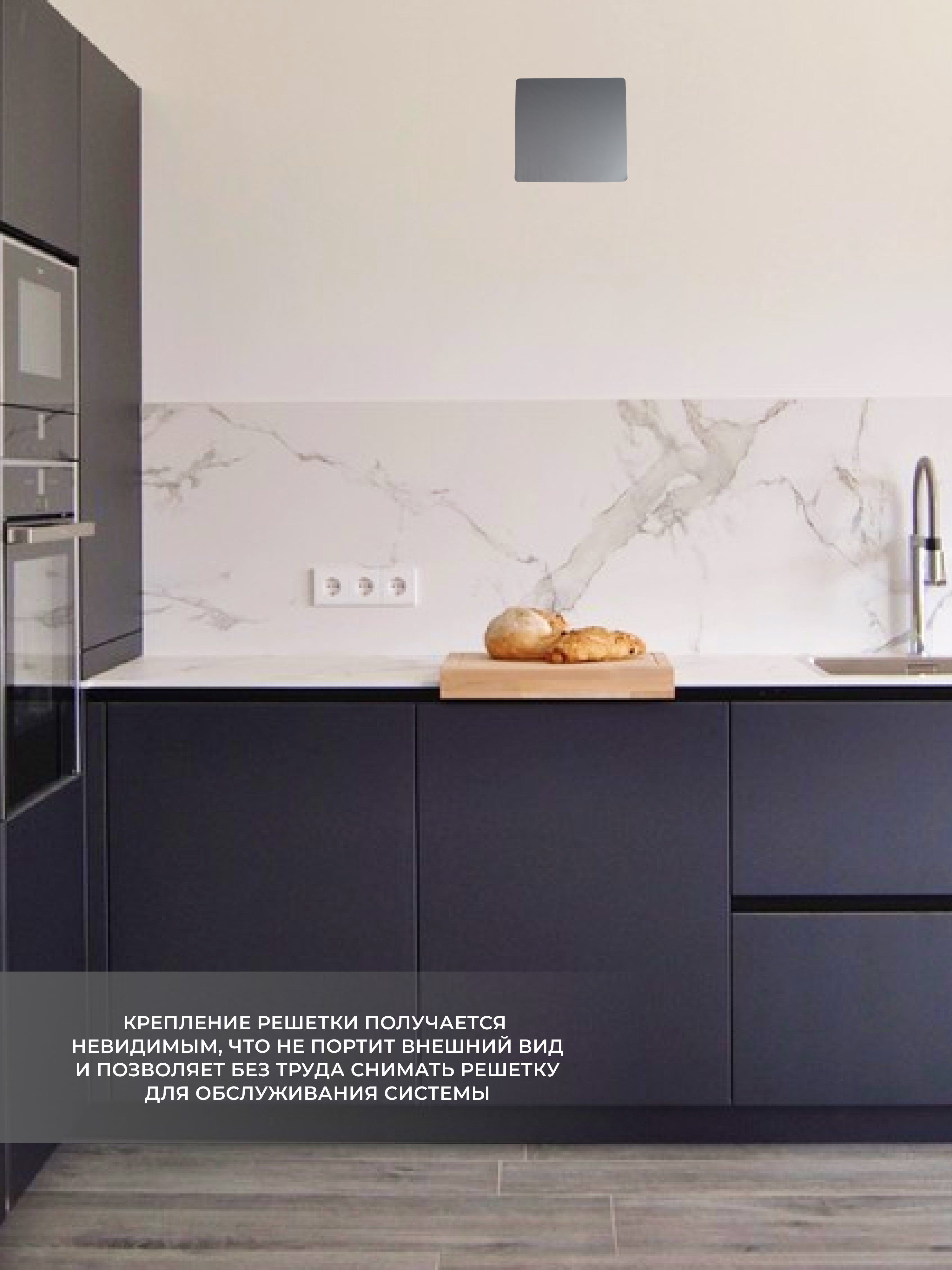 Решетка выполнена в современном стиле таким образом, что воздух поступает в вентиляционную шахту по периметру решетки. Благодаря данной конструкции - само вентиляционное отверстие не видно совсем. Оно закрывается декоративной панелью, при этом не перекрывая доступ воздуха в шахту.