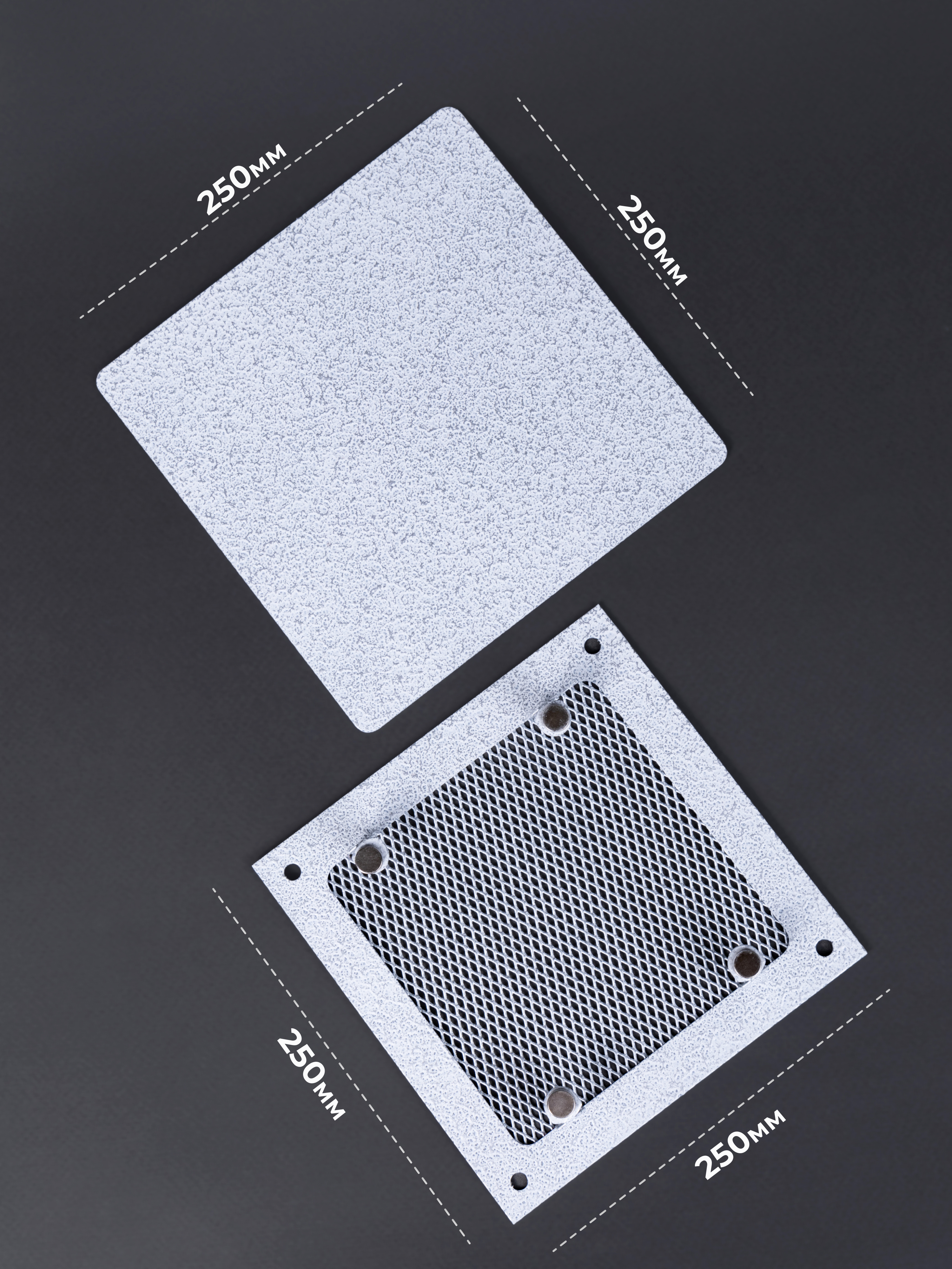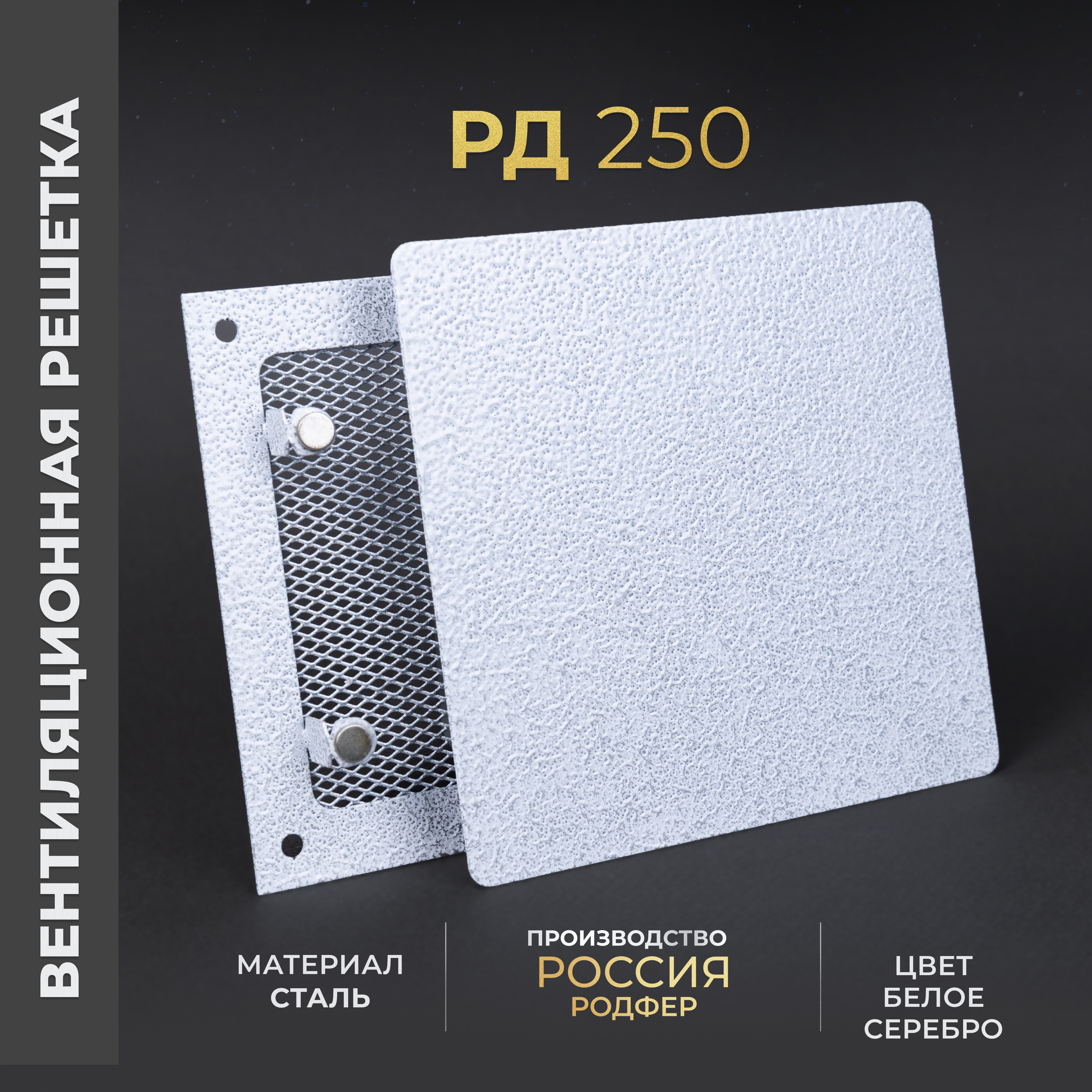 Вентиляционная решетка на магнитах от производителя Родфер имеет внешний размер 250 х 250 мм и выполнена из высококачественной стали, покрыта плотным стойким слоем краски. Решетка состоит из двух частей:
