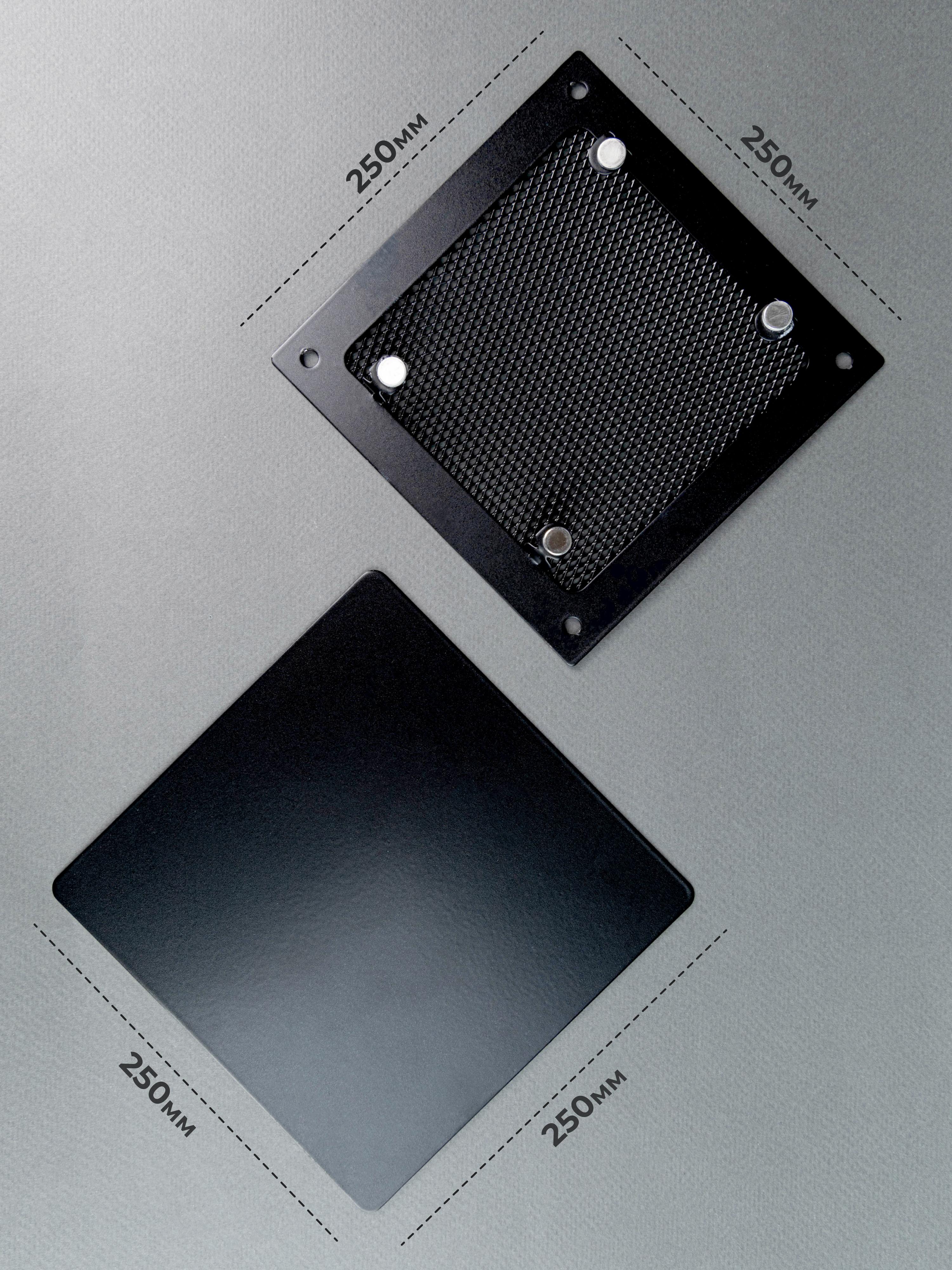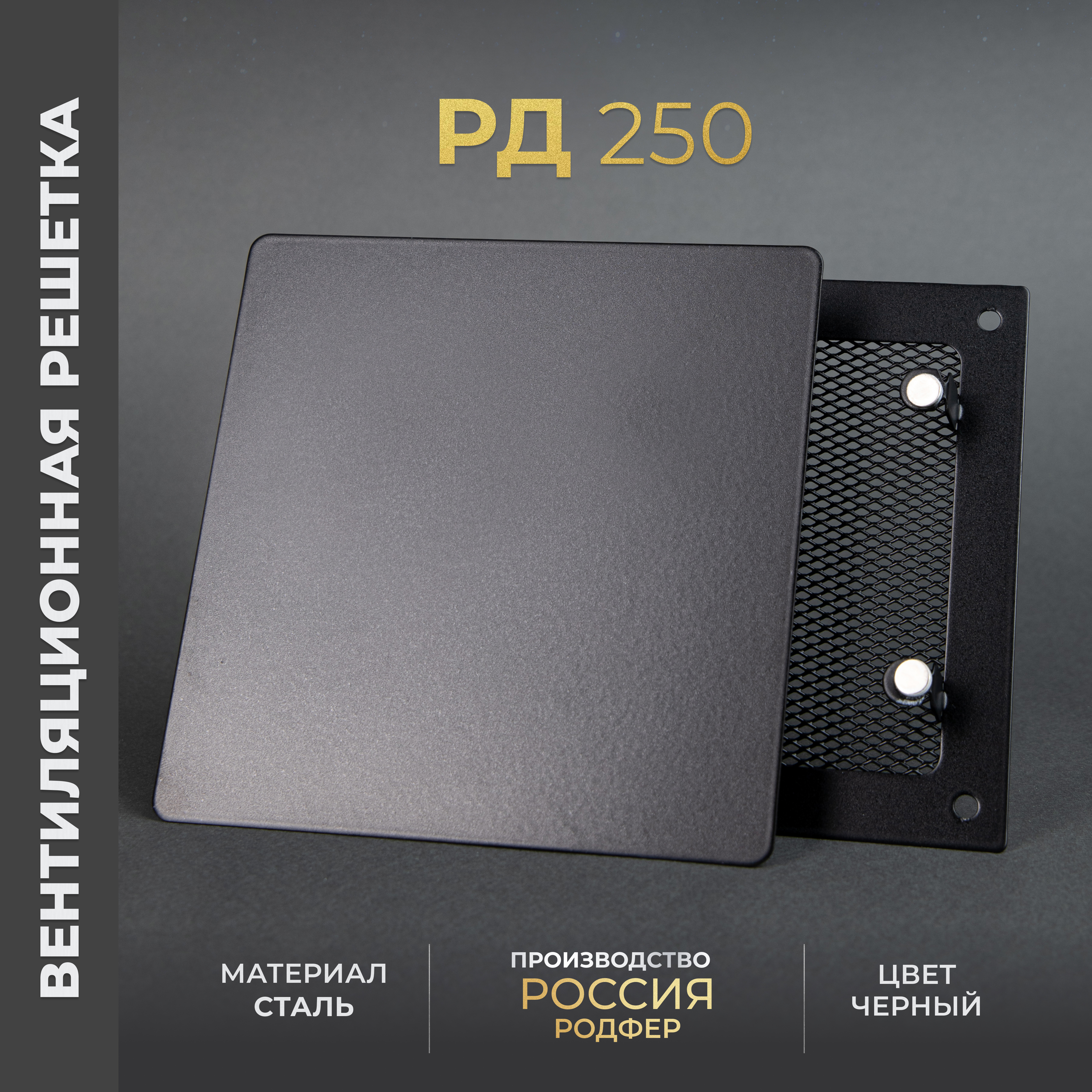 Вентиляционная решетка на магнитах от производителя Родфер имеет внешний размер 250 х 250 мм и выполнена из высококачественной стали, покрыта плотным стойким слоем краски. Решетка состоит из двух частей: