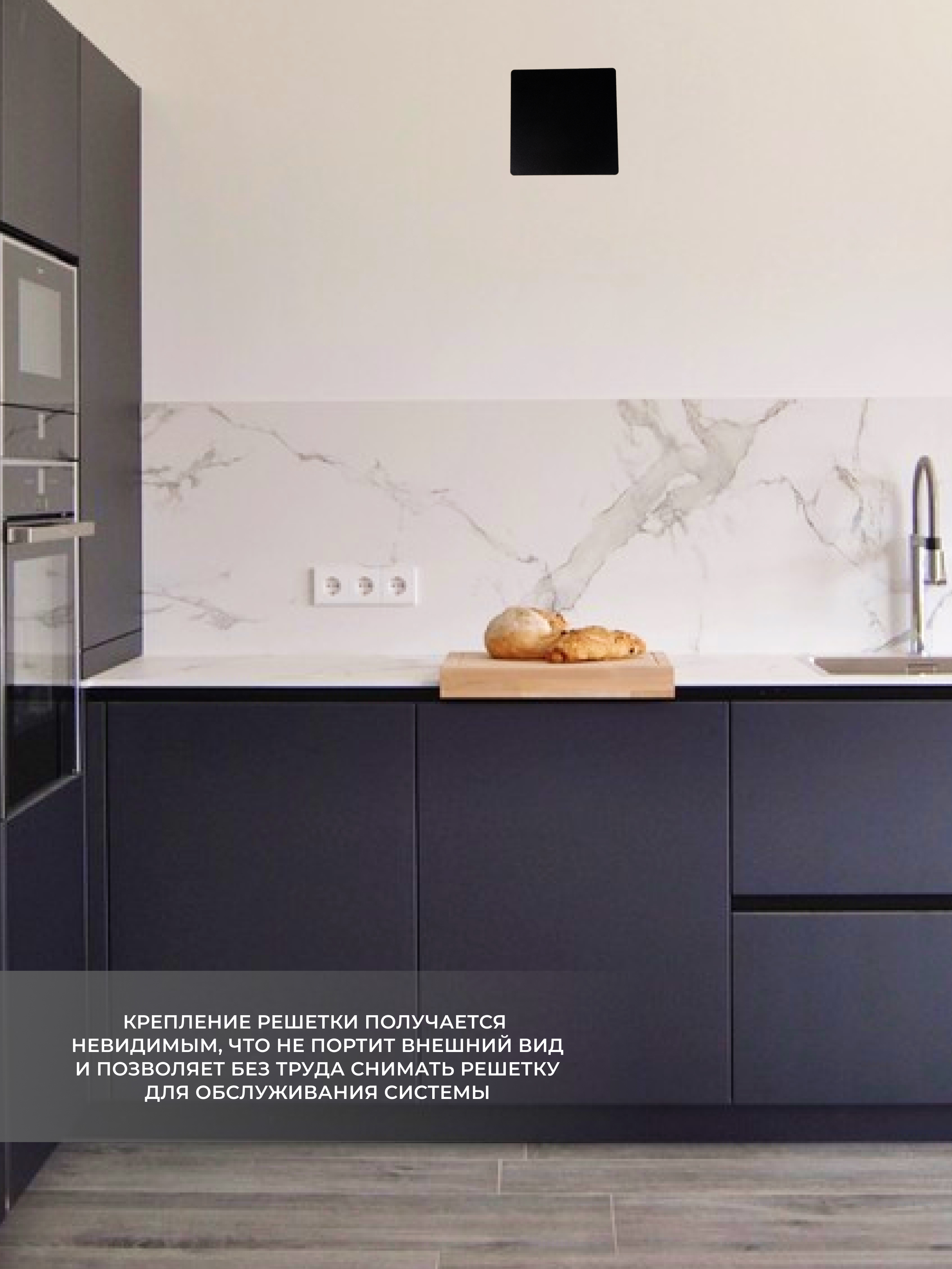Решетка выполнена в современном стиле таким образом, что воздух поступает в вентиляционную шахту по периметру решетки.