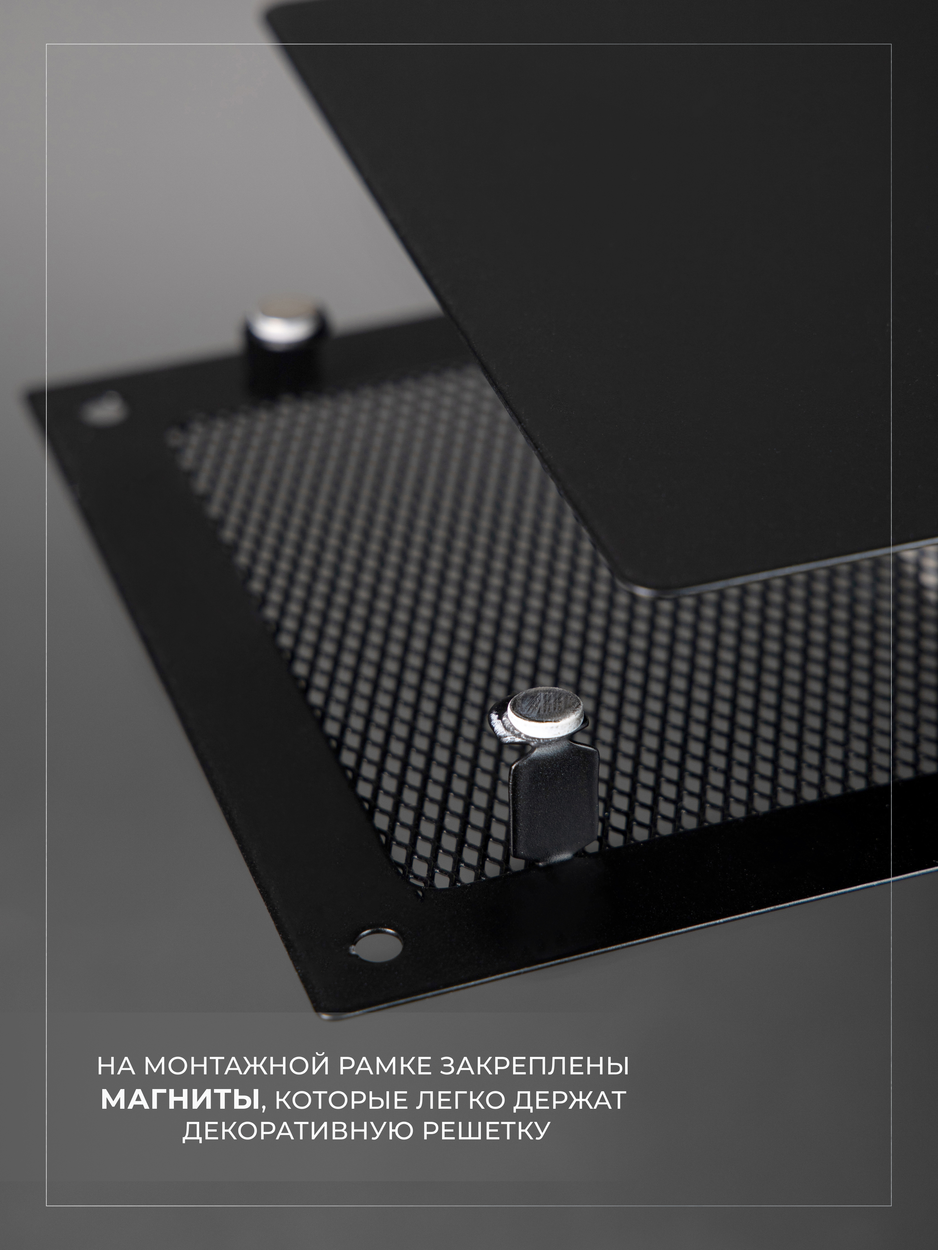 2.Декоративный элемент, который надежно фиксируется к монтажной рамке при помощи неодимовых магнитов. Благодаря данной конструкции не виден крепеж решетки, что позволяет сохранить эстетику помещения в чистом виде. При необходимости решетку легко снимать для чистки без использования дополнительных инструментов. Можно крепить на стену, потолок.