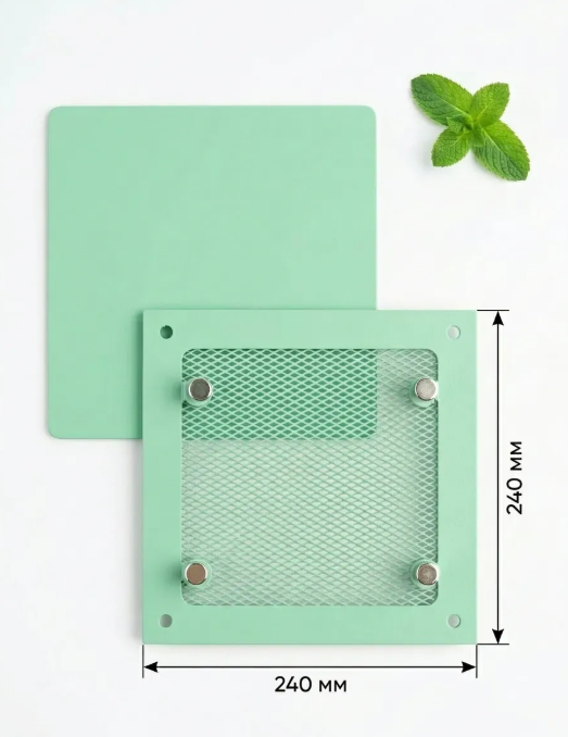 Вентиляционная решетка на магнитах от производителя Родфер имеет внешний размер 250 х 250 мм и выполнена из высококачественной стали, покрыта плотным стойким слоем краски. Решетка состоит из двух частей: