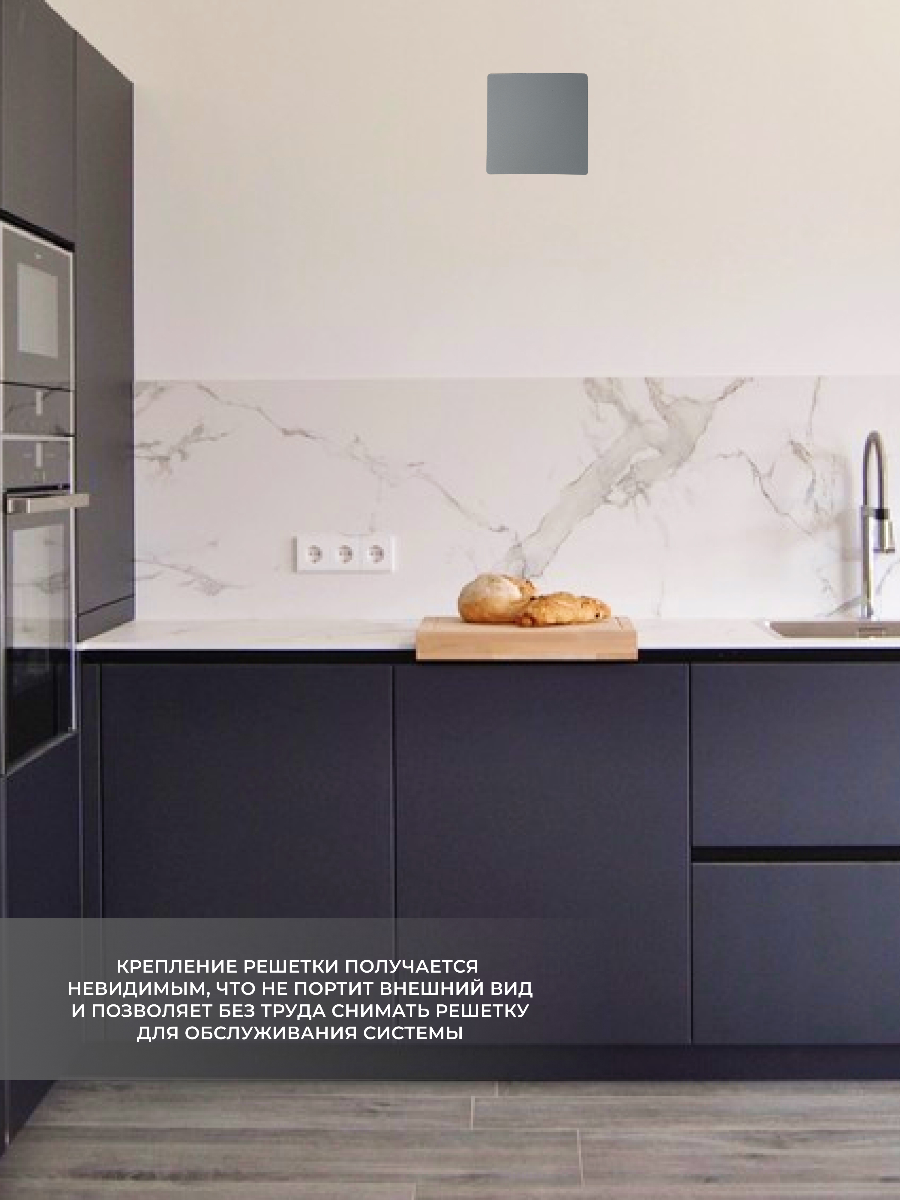 Решетка выполнена в современном стиле таким образом, что воздух поступает в вентиляционную шахту по периметру решетки.