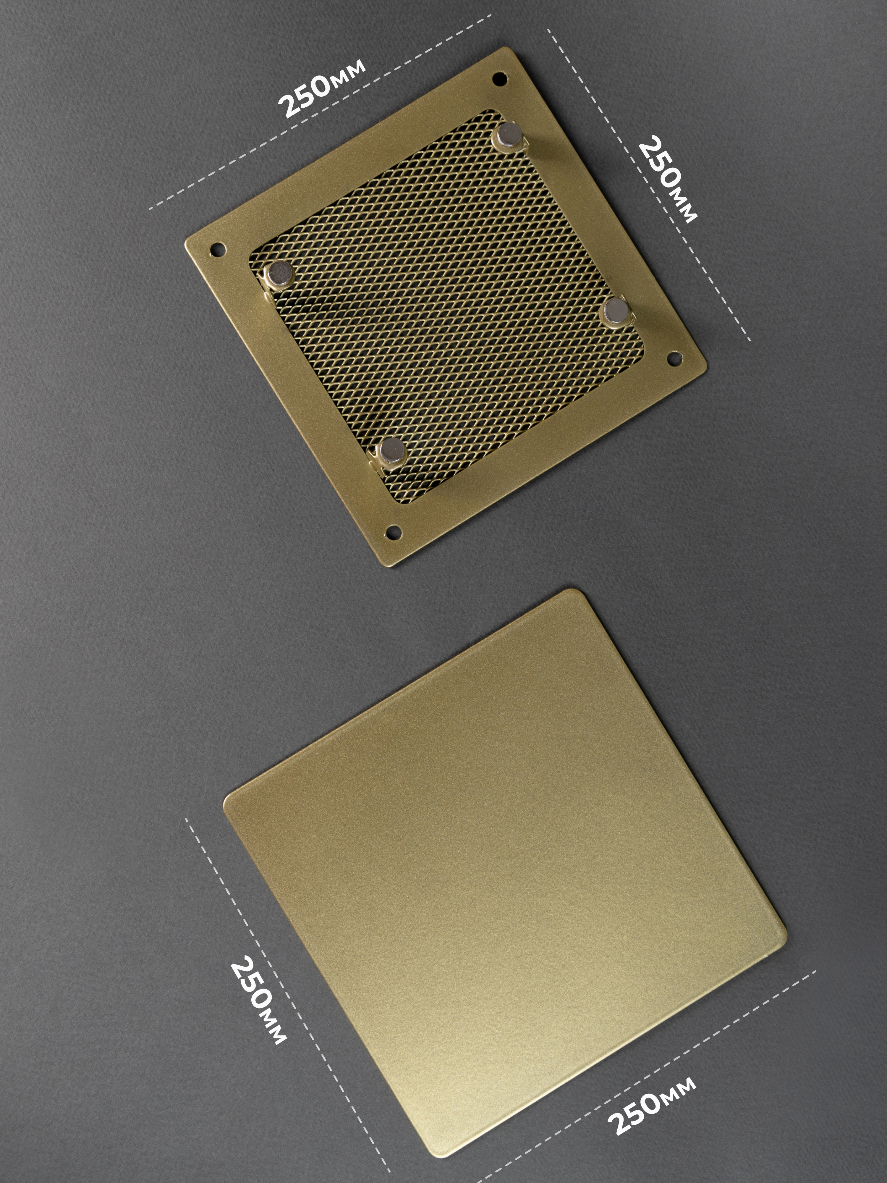 Вентиляционная решетка на магнитах от производителя Родфер имеет внешний размер 250 х 250 мм и выполнена из высококачественной стали, покрыта плотным стойким слоем краски. Решетка состоит из двух частей: