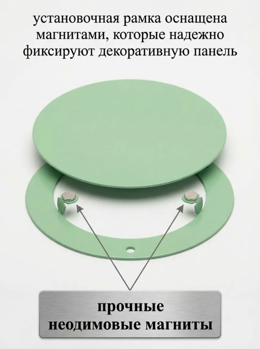 Решётка состоит из двух элементов: рамки, которая крепится к стене, и декоративной части, удерживаемой на магнитах. Такое устройство обеспечивает не только функциональность, но и эстетичный внешний вид, не нарушая общей гармонии интерьера.