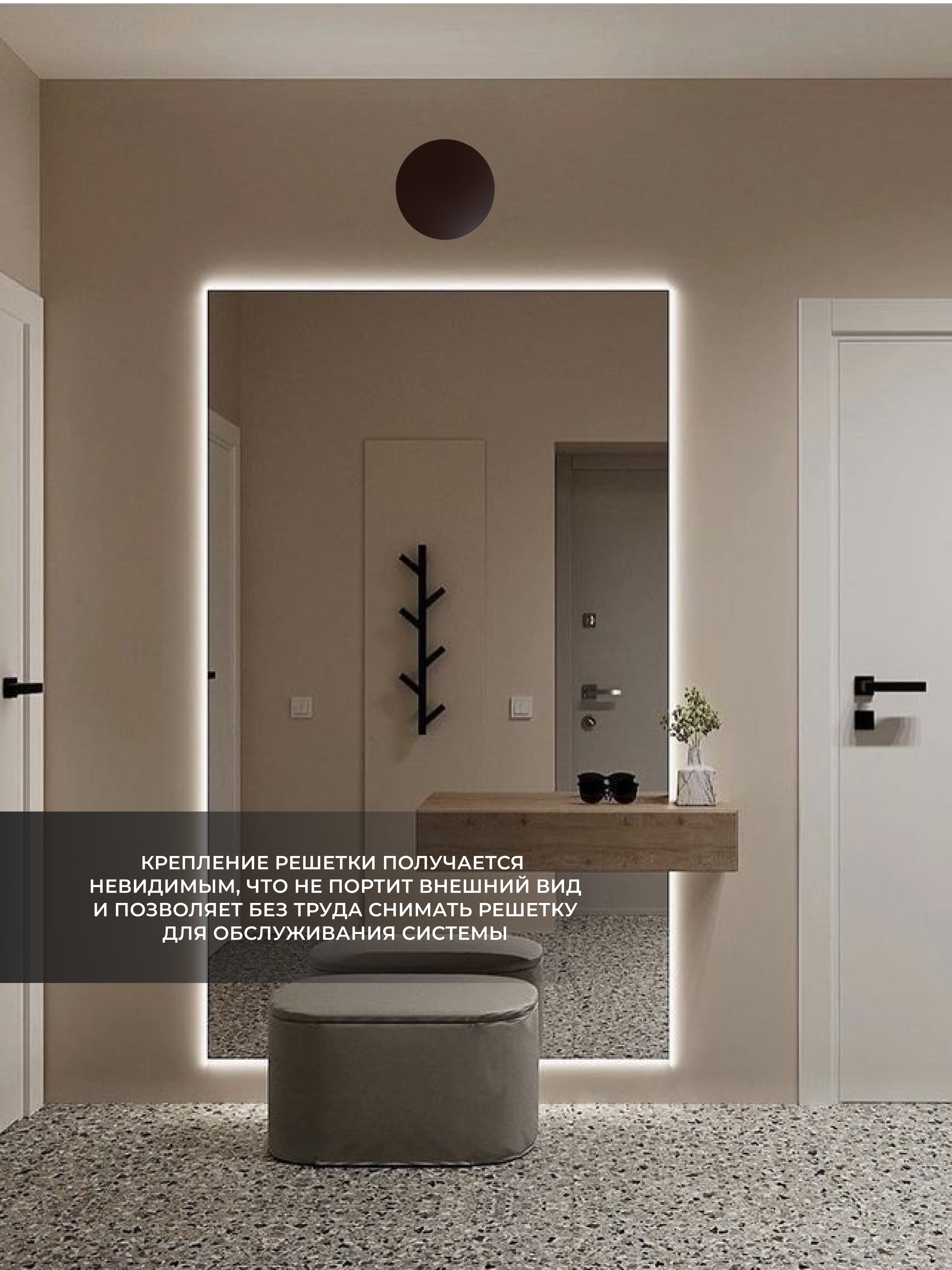 Решётка состоит из двух элементов: рамки, которая крепится к стене, и декоративной части, удерживаемой на магнитах. Такое устройство обеспечивает не только функциональность, но и эстетичный внешний вид, не нарушая общей гармонии интерьера.
