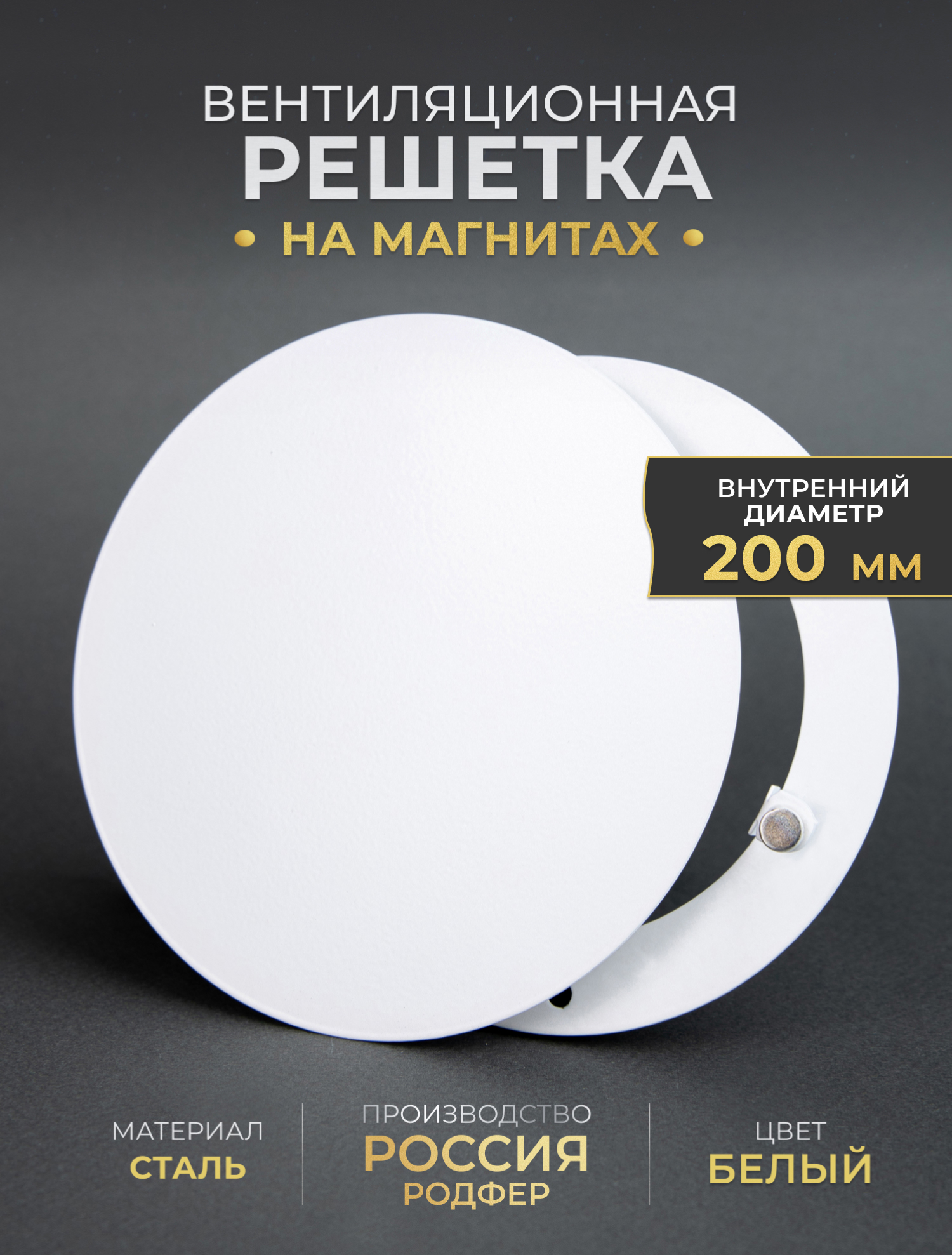 Вентиляционная решетка на магнитах выполнена из стали и состоит из двух частей. Рамка крепится к стене при помощи саморезов (5мм) или клея (жидких гвоздей), а декоративная часть фиксируется к рамке при помощи неодимовых магнитов. Рамка выкрашена порошковой краской (эмалью) в специальной печке (камере полимеризации).