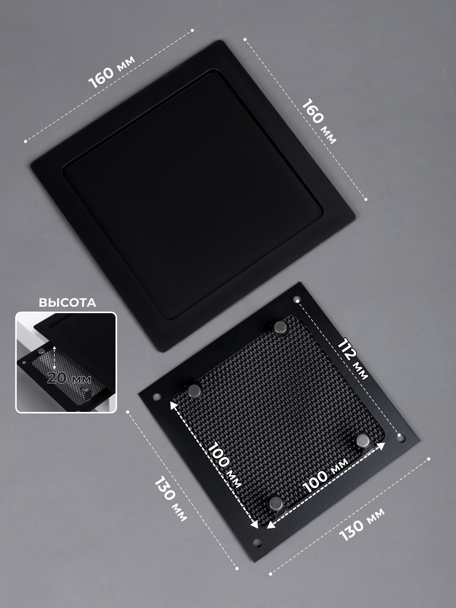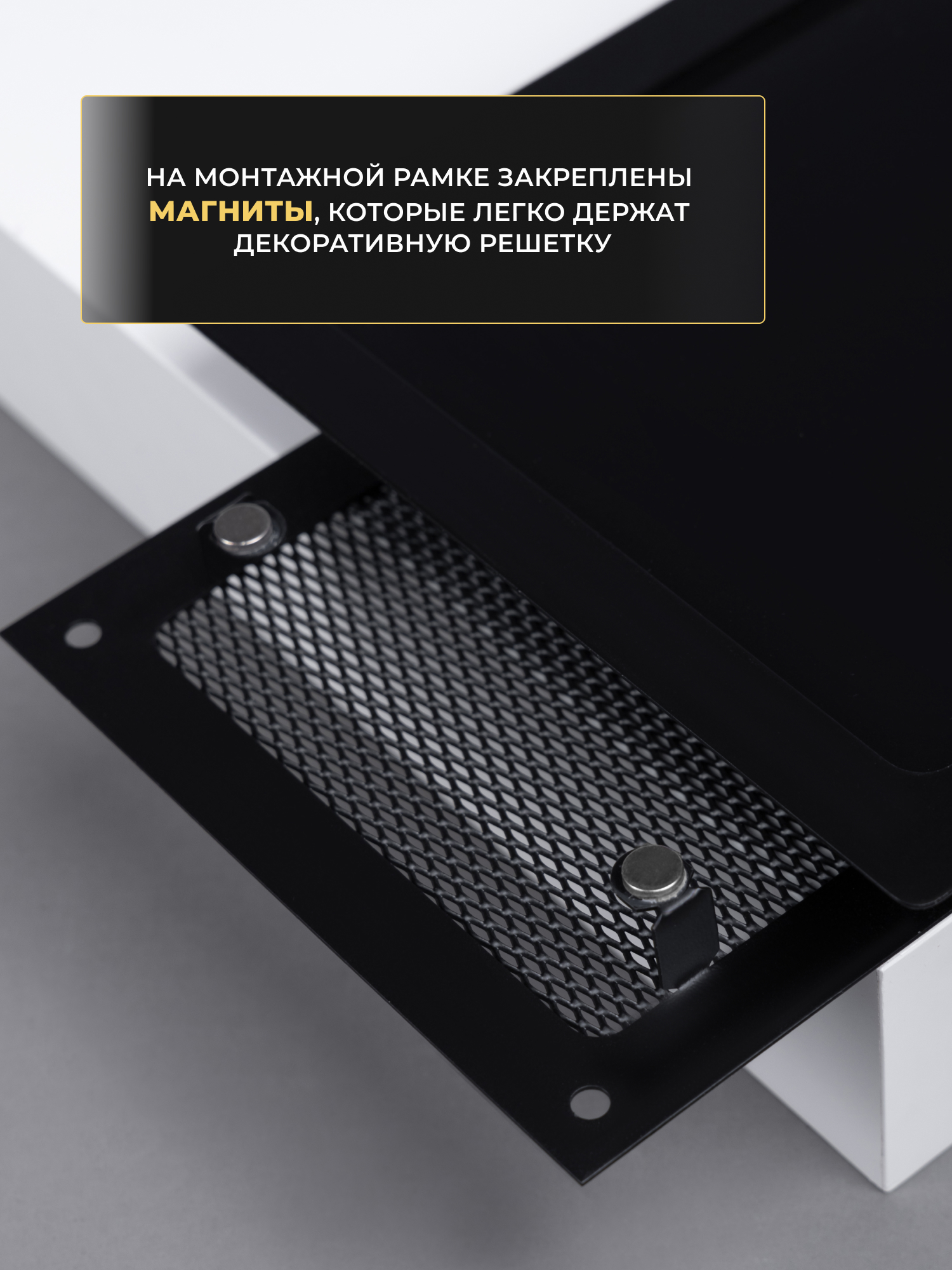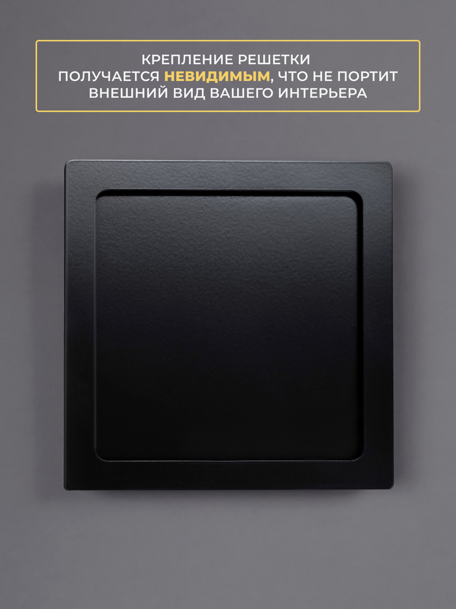 Решетка вентиляционная на магнитах Родфер выполнена из стали и состоит из двух частей. Рамка крепится к стене при помощи саморезов(5 мм) или клея, а декоративная часть с сеткой фиксируется к рамке при помощи неодимовых магнитов. Рамка и наружная часть выкрашены порошковой эмалью в специальной печке камере полимеризации.