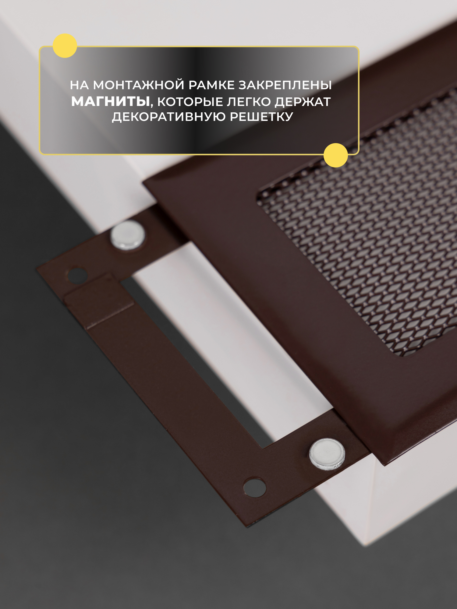 Решетка вентиляционная на магнитах Родфер выполнена из стали и состоит из двух частей. Рамка решетки крепится к стене при помощи саморезов или клея, а декоративная часть с сеткой фиксируется к рамке при помощи неодимовых магнитов. Рамка и наружная часть выкрашены порошковой краской (эмалью) в специальной печке при высоких температурах. Обслуживать такую решетку легко и просто, достаточно просто снять верхнюю рамку применив небольшое усилие. При этом нет необходимости использовать дополнительные инструменты.