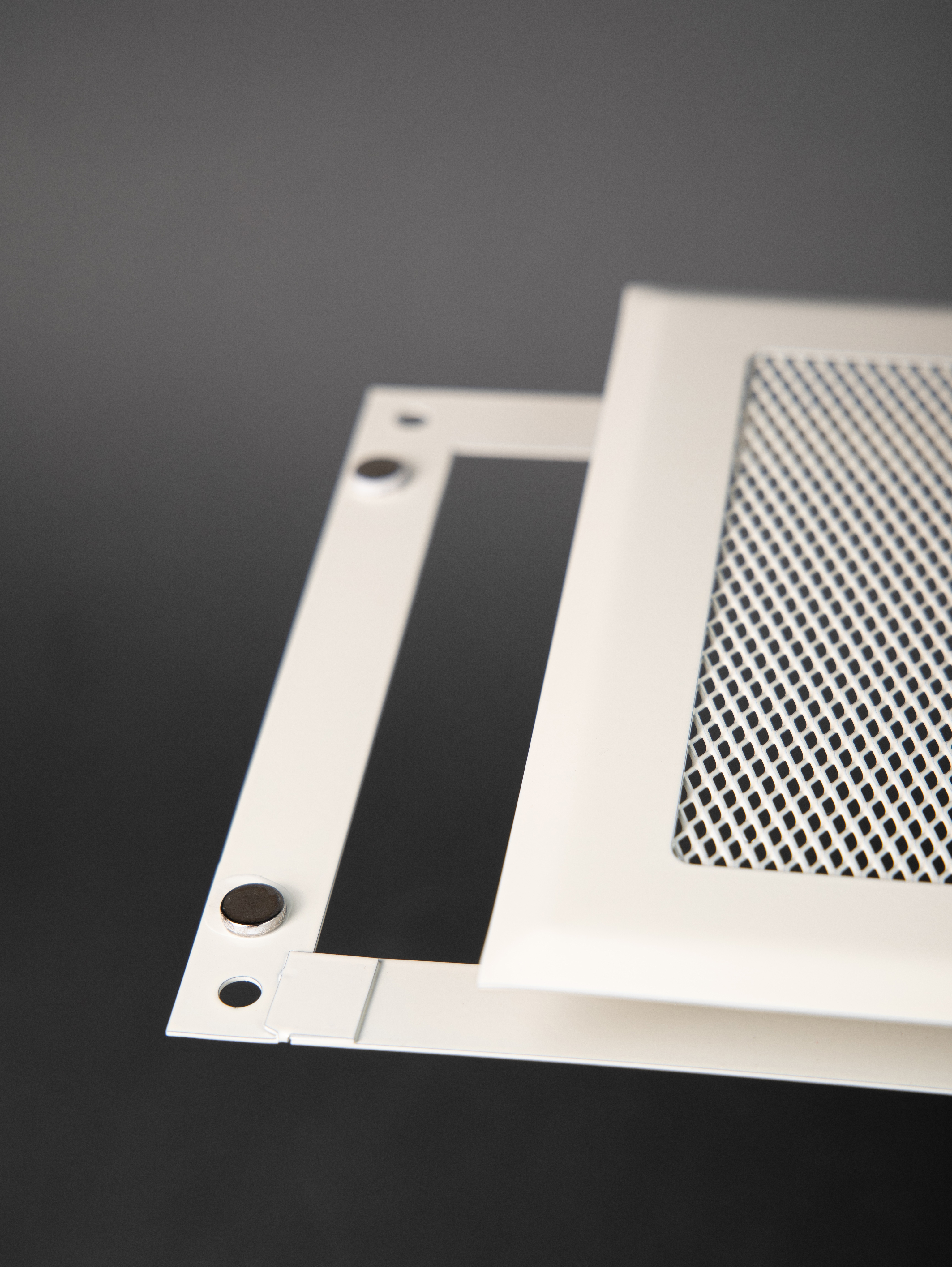 Решетка вентиляционная на магнитах Родфер выполнена из стали и состоит из двух частей. Рамка решетки крепится к стене при помощи саморезов или клея, а декоративная часть с сеткой фиксируется к рамке при помощи неодимовых магнитов. Рамка и наружная часть выкрашены порошковой краской (эмалью) в специальной печке при высоких температурах. Обслуживать такую решетку легко и просто, достаточно просто снять верхнюю рамку применив небольшое усилие. При этом нет необходимости использовать дополнительные инструменты.