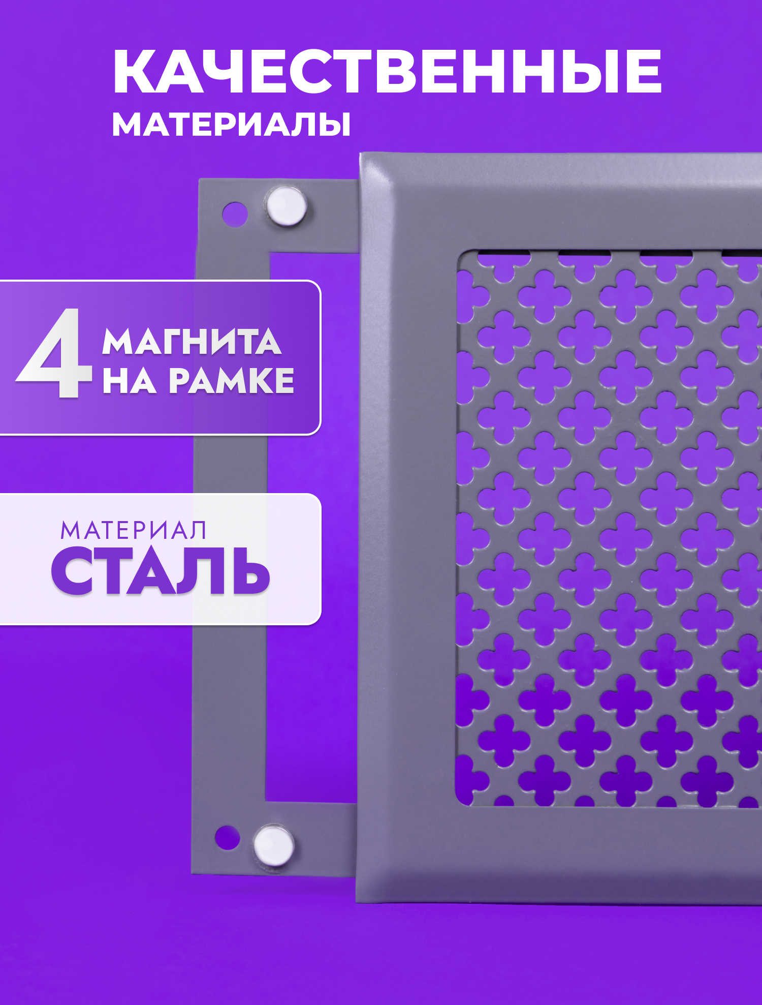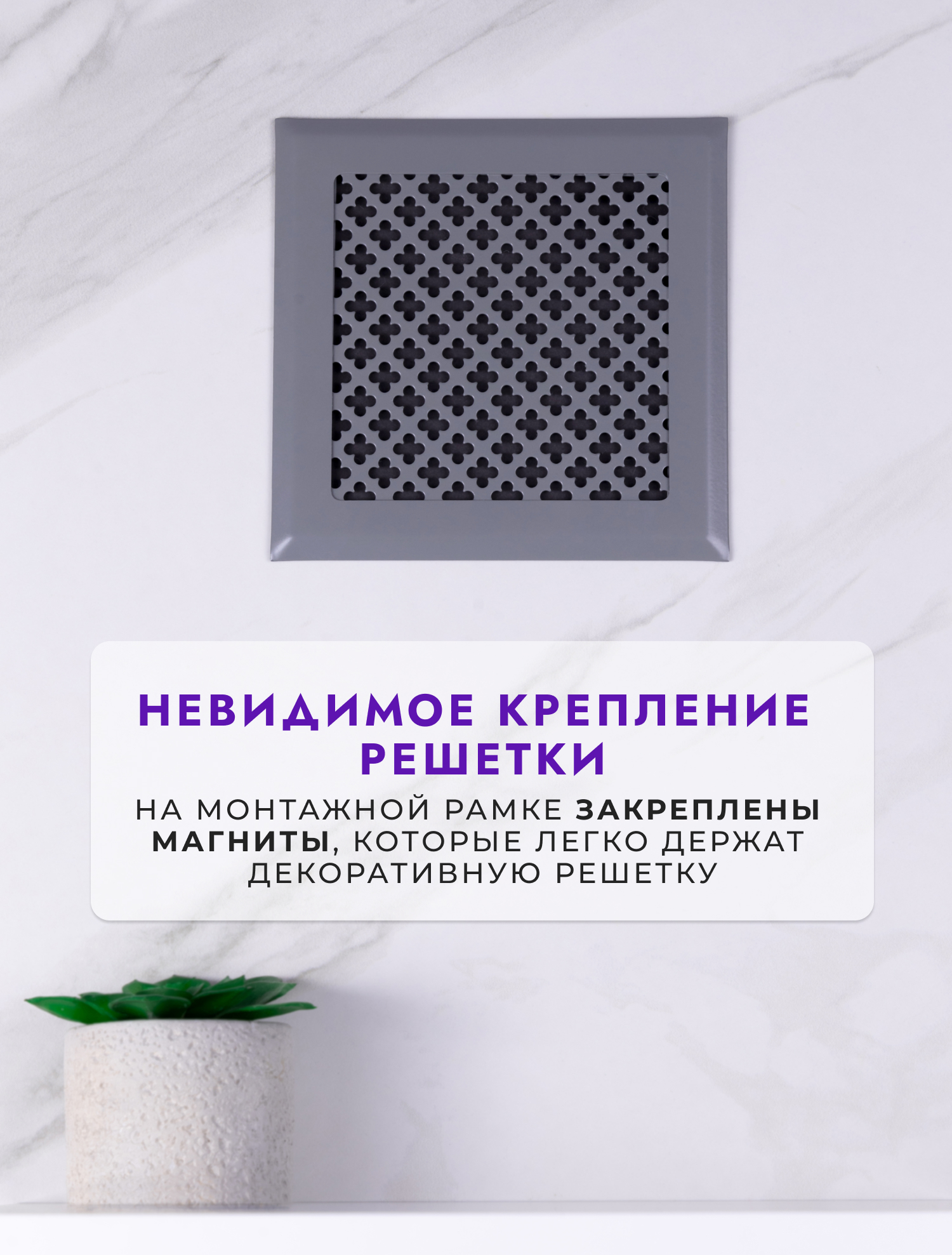 Вентиляционная решетка на магнитах РодФер выполнена из стали и состоит из двух частей. Рамка крепится к стене при помощи саморезов (5мм) или клея, а декоративная часть фиксируется к рамке при помощи неодимовых магнитов. Рамка и наружная часть выкрашены порошковой краской (эмалью) в специальной печке при высоких температурах. Обслуживать такую решетку легко и просто, достаточно просто снять верхнюю рамку применив небольшое усилие. При этом нет необходимости использовать дополнительные инструменты. Область применения данных решеток очень широка: приточная и вытяжная вентиляция в домах и квартирах, офисах и других помещениях, декорирование ниш, к которым нужен периодический доступ и т. д.